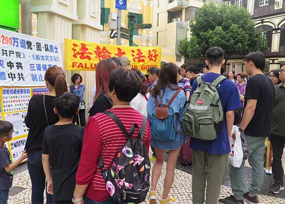 四月二十二日,澳门法轮功学员于玫瑰堂前地步行街举行集会,纪念一九九九年四月二十五日逾万名法轮功学员和平上访,合法维护自己权利。
