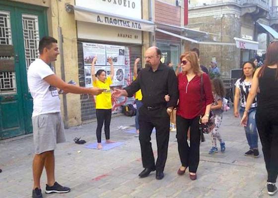 四月二十二日下午,塞浦路斯法轮功学员们来到首都尼科西亚老城区“莱德拉斯街”步行街上举办活动,纪念四·二五和平上访十九周年。