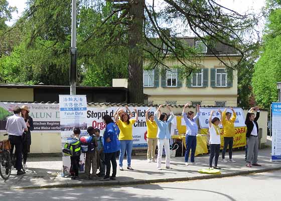 四月二十五日,来自德国巴伐利亚州、巴符州和奥地利萨尔茨堡的部分法轮功学员在慕尼黑中领馆前纪念四·二五和平上访十九周年。