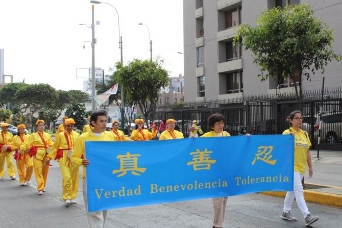 当天上午九点,由法轮功学员组成的腰鼓队,身穿醒目金黄色炼功服,头戴黄色围巾,配上腰鼓,从自由广场(INDEPEDENCIA OVALO)开始,途径十条聚集热闹市场和商铺的街道,一直走到活动中心图帕克阿马鲁广场(LA PLAZA TUPAC AMARU)。沿途的民众看到中国民族服饰,听到阵阵鼓声,纷纷驻足观看,两名店员竖起了大拇指点赞,还有人索取法轮功真相传单,有的询问什么是法轮大法,法轮功的炼功点在何处。