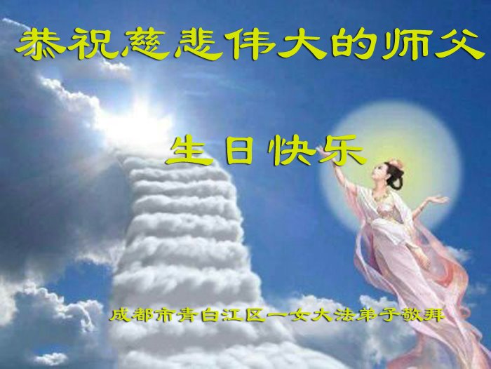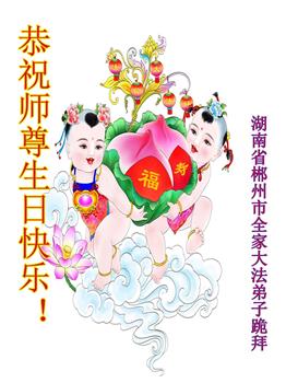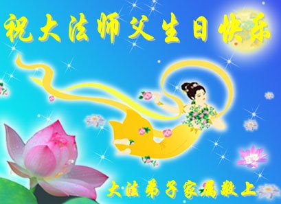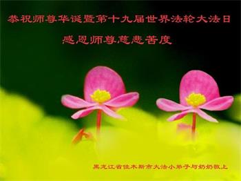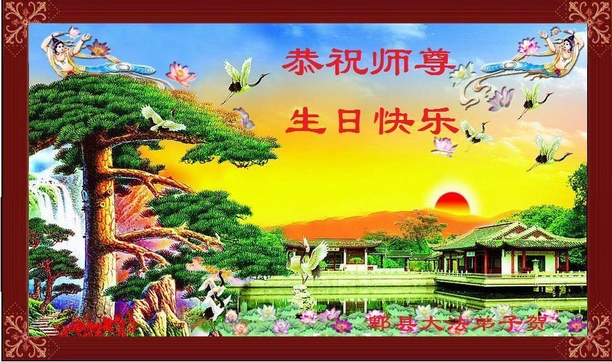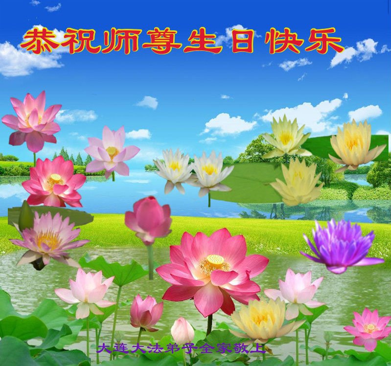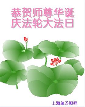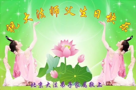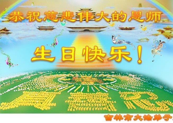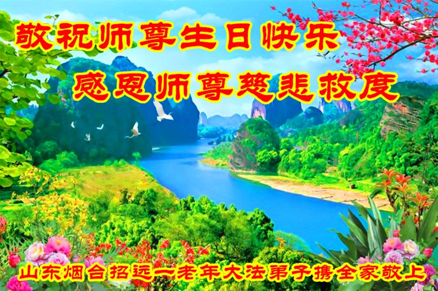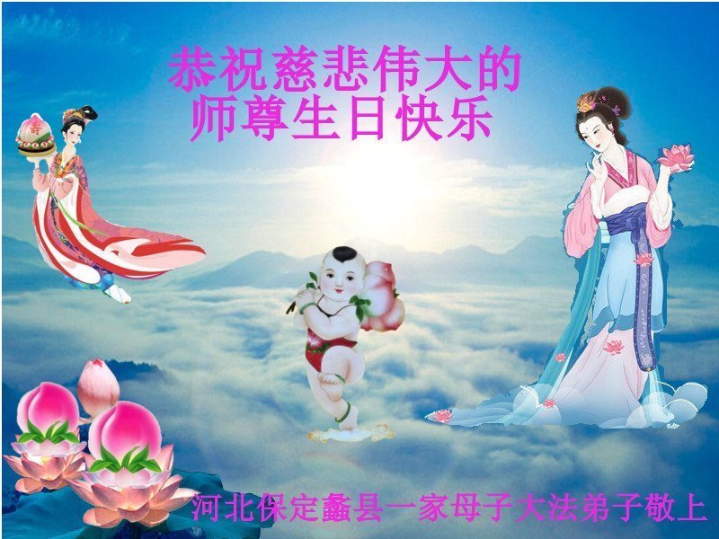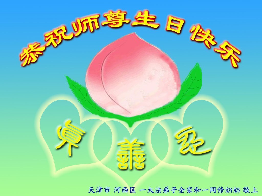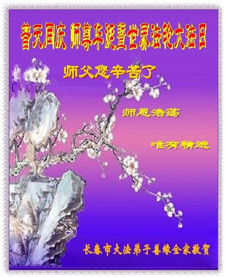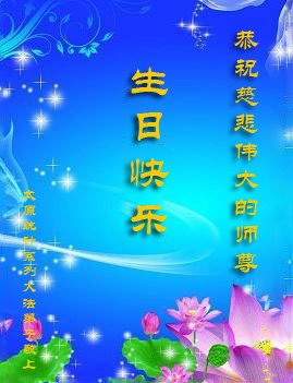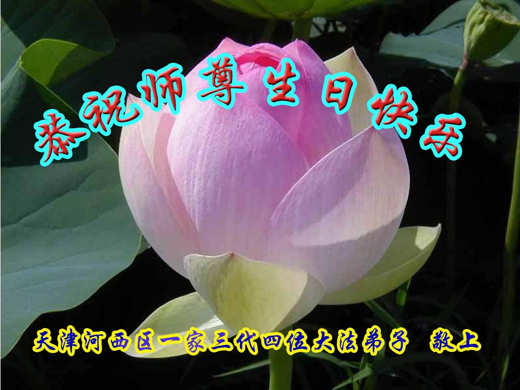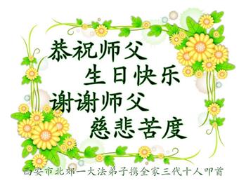 师尊您好。我代表全家六口人(其中一人不修炼,其他人都开始看书)恭祝伟大的师尊生日快乐!我一定会加倍努力,做好大法弟子应该做好的三件事来报答师尊对我们全家的救度之恩。