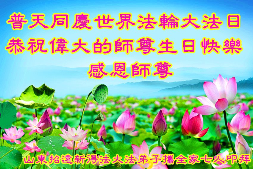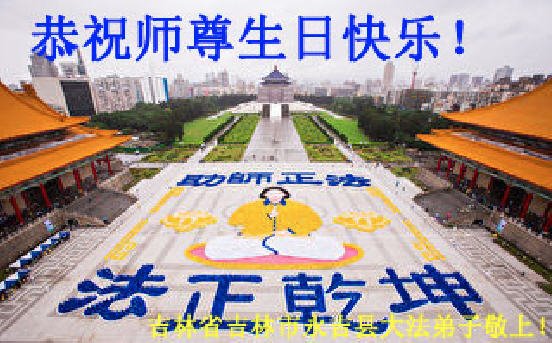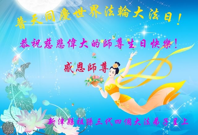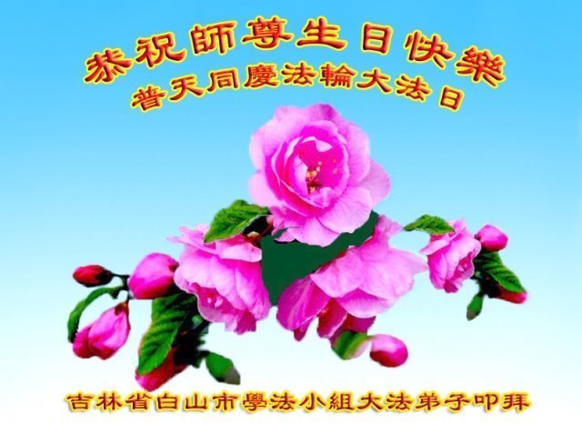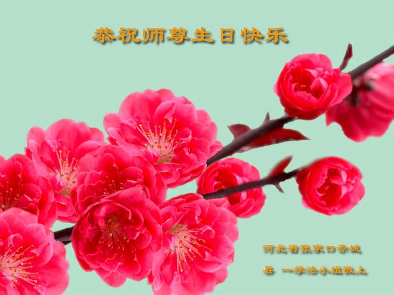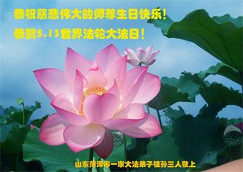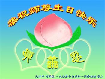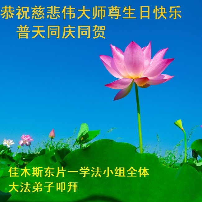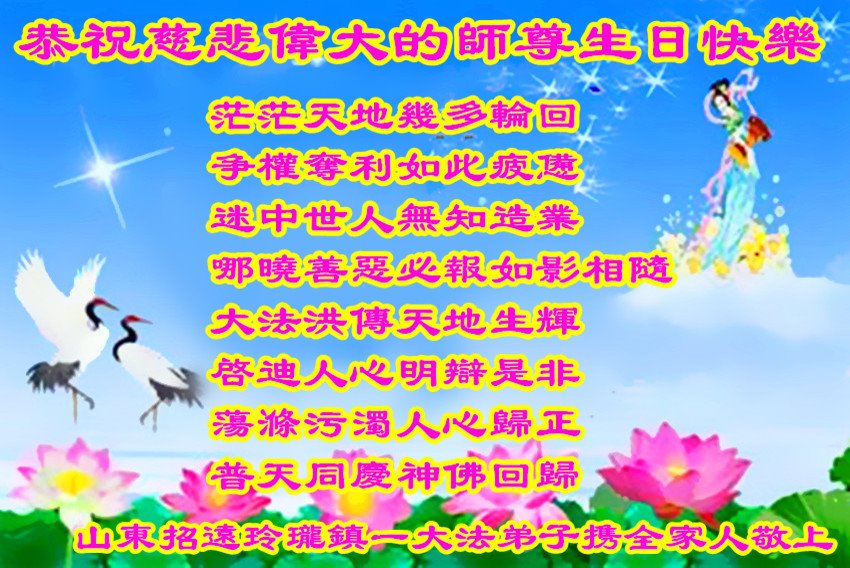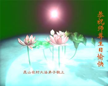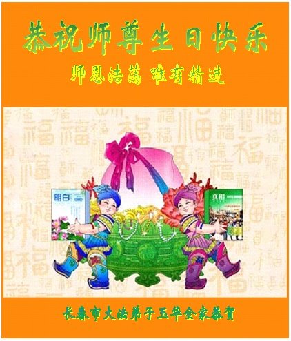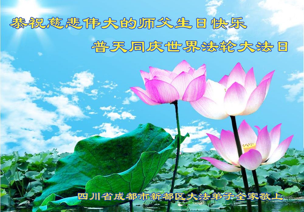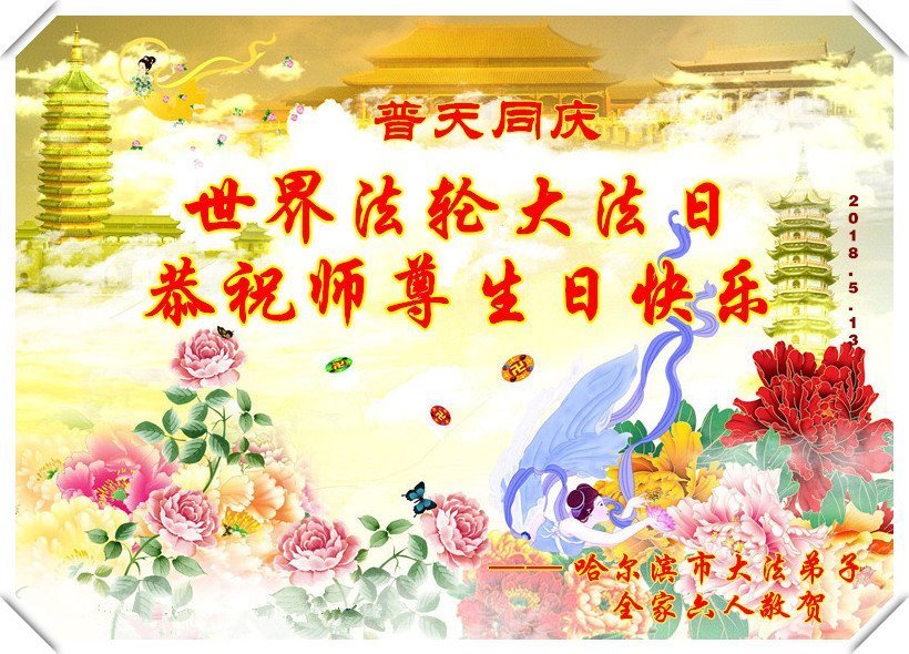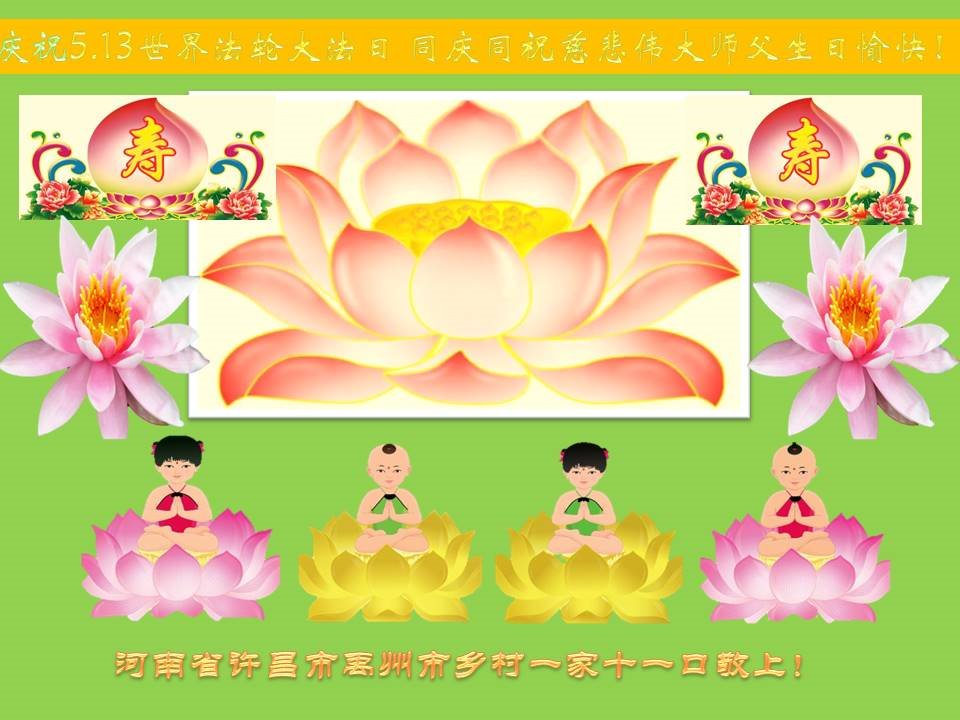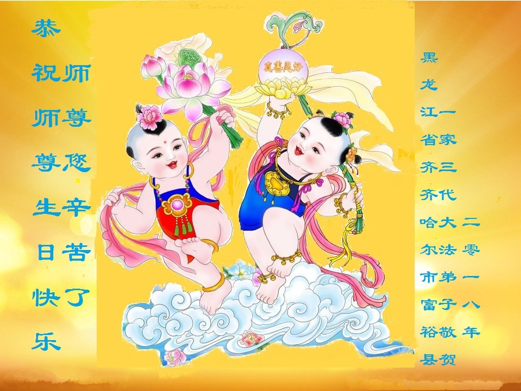师尊您好。我代表全家六口人(其中一人不修炼,其他人都开始看书)恭祝伟大的师尊生日快乐!我一定会加倍努力,做好大法弟子应该做好的三件事来报答师尊对我们全家的救度之恩。