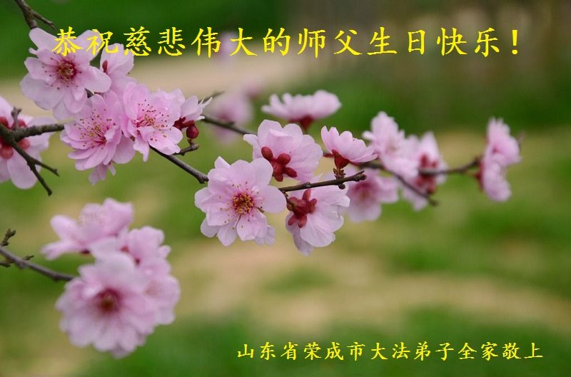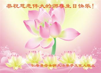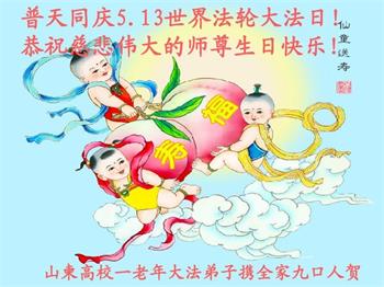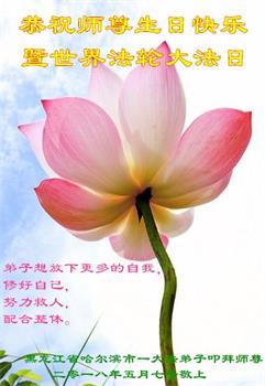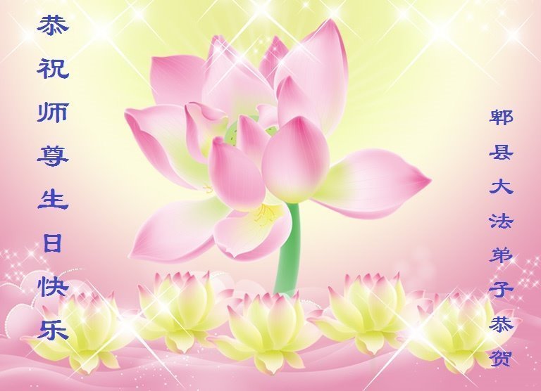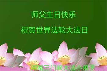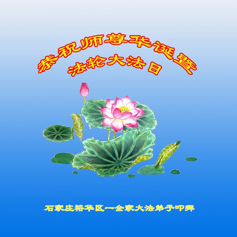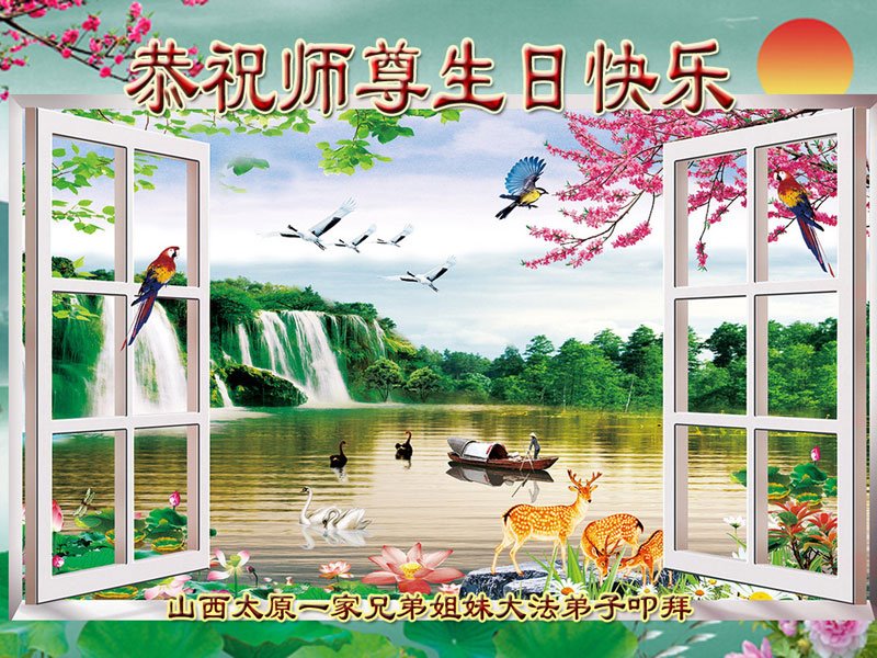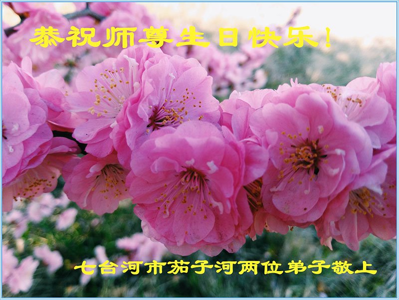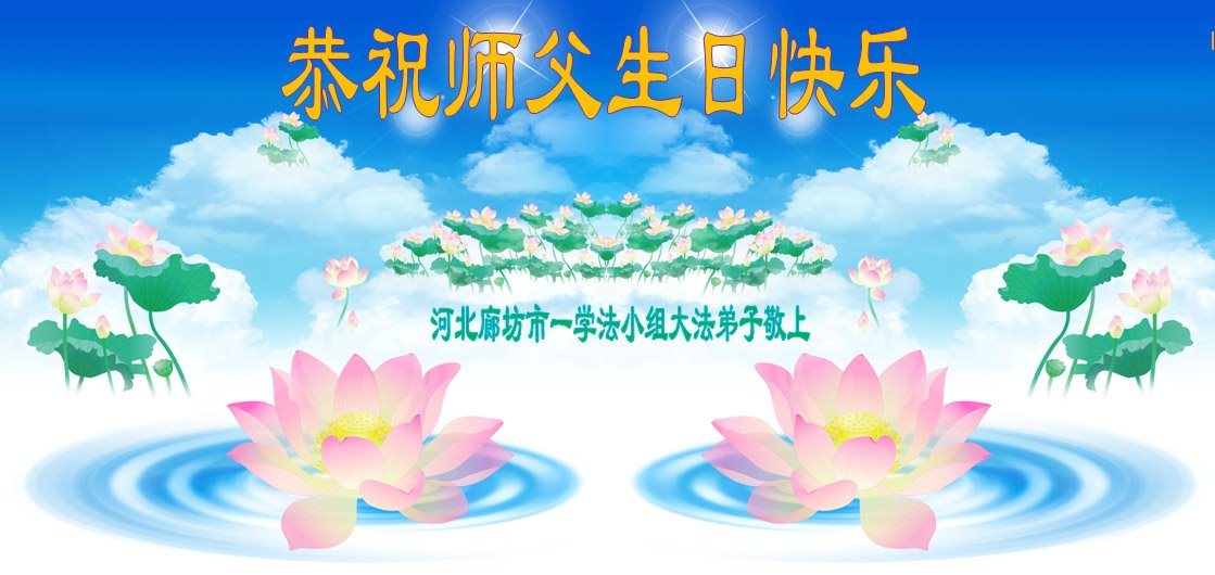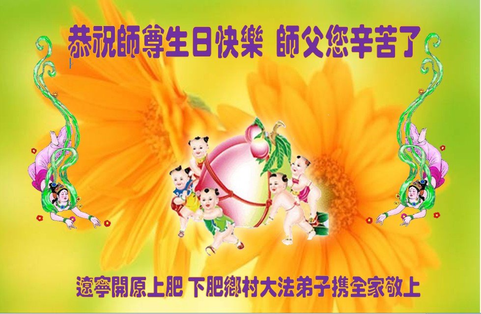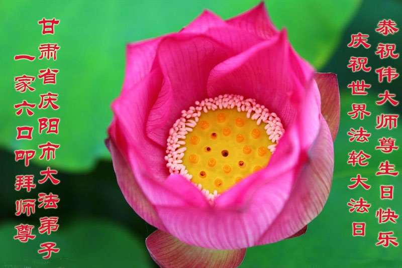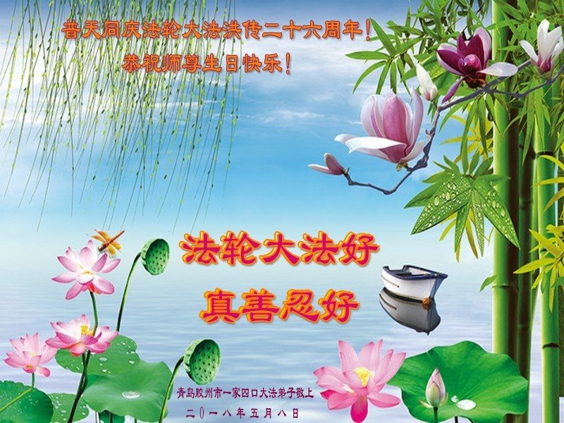 师尊您好。我代表全家六口人(其中一人不修炼,其他人都开始看书)恭祝伟大的师尊生日快乐!我一定会加倍努力,做好大法弟子应该做好的三件事来报答师尊对我们全家的救度之恩。