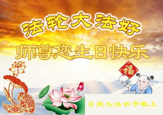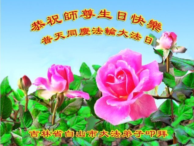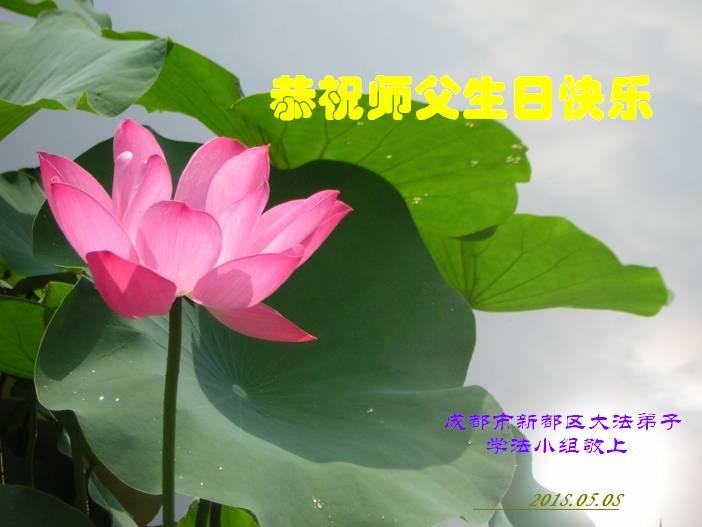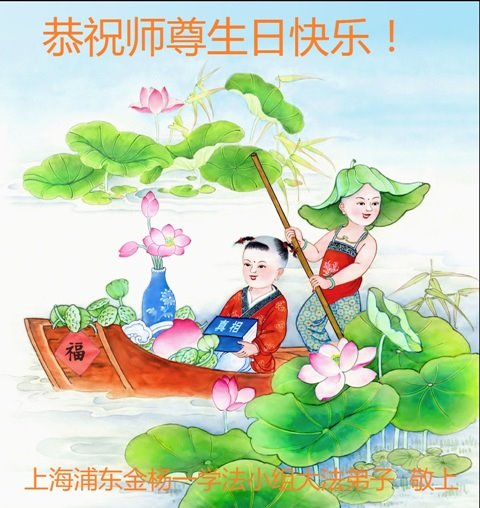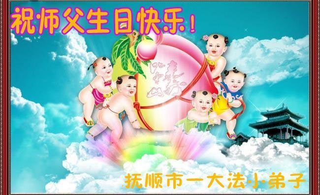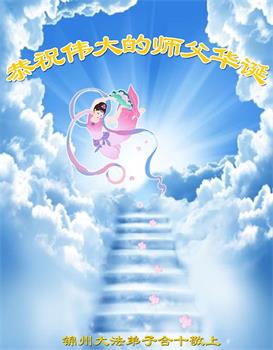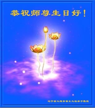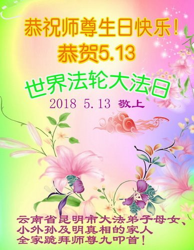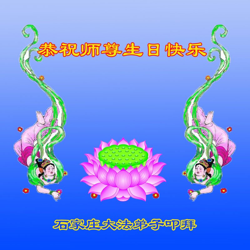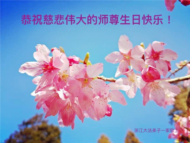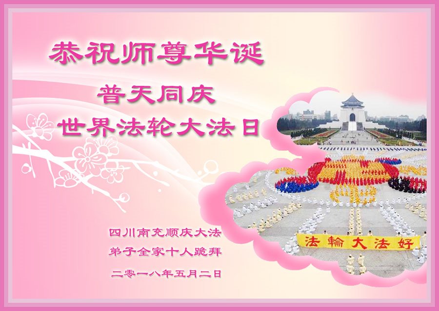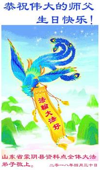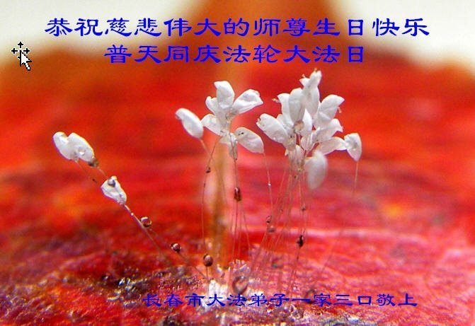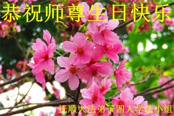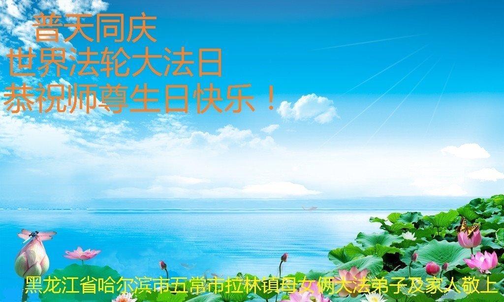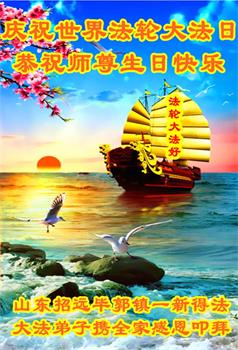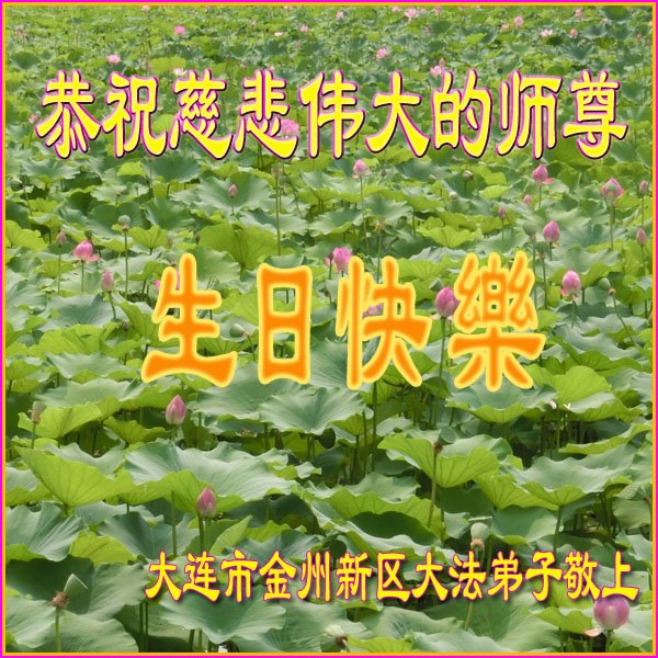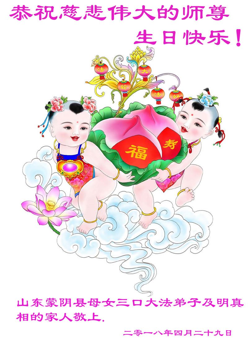 师尊您好。我代表全家六口人(其中一人不修炼,其他人都开始看书)恭祝伟大的师尊生日快乐!我一定会加倍努力,做好大法弟子应该做好的三件事来报答师尊对我们全家的救度之恩。