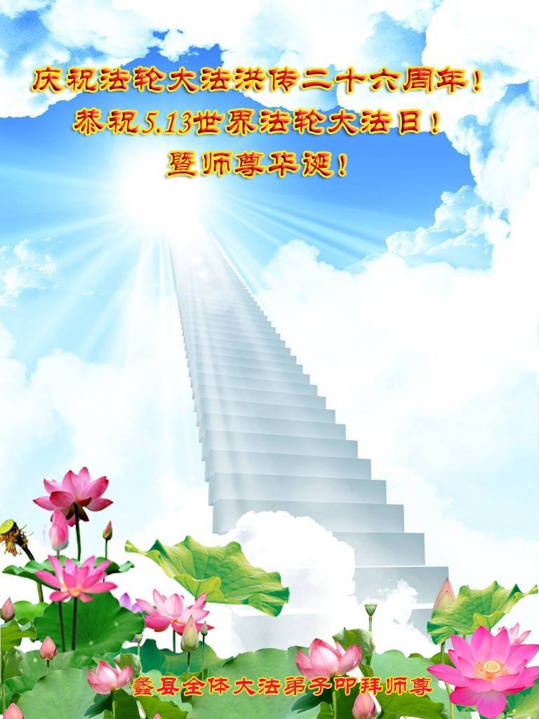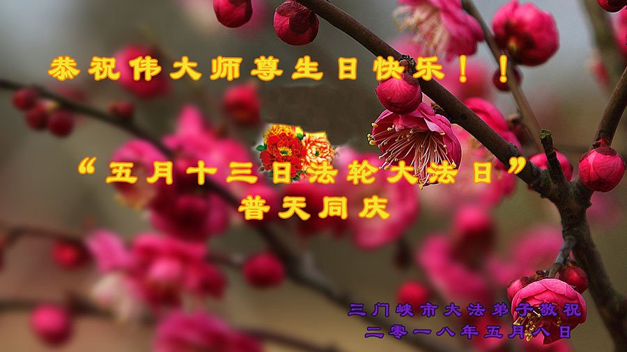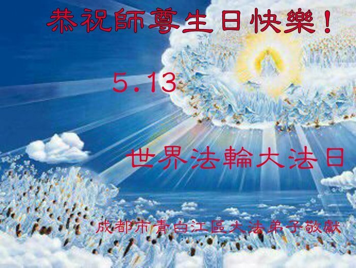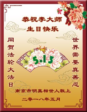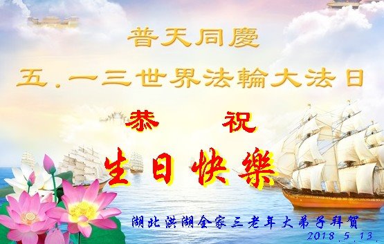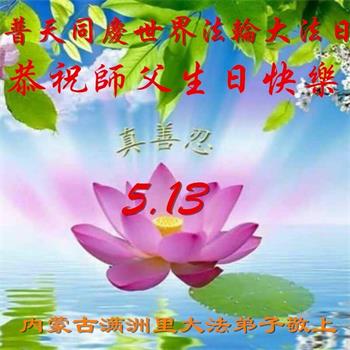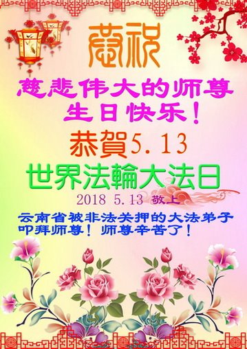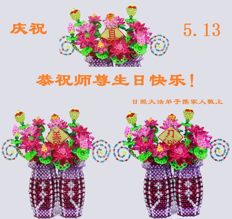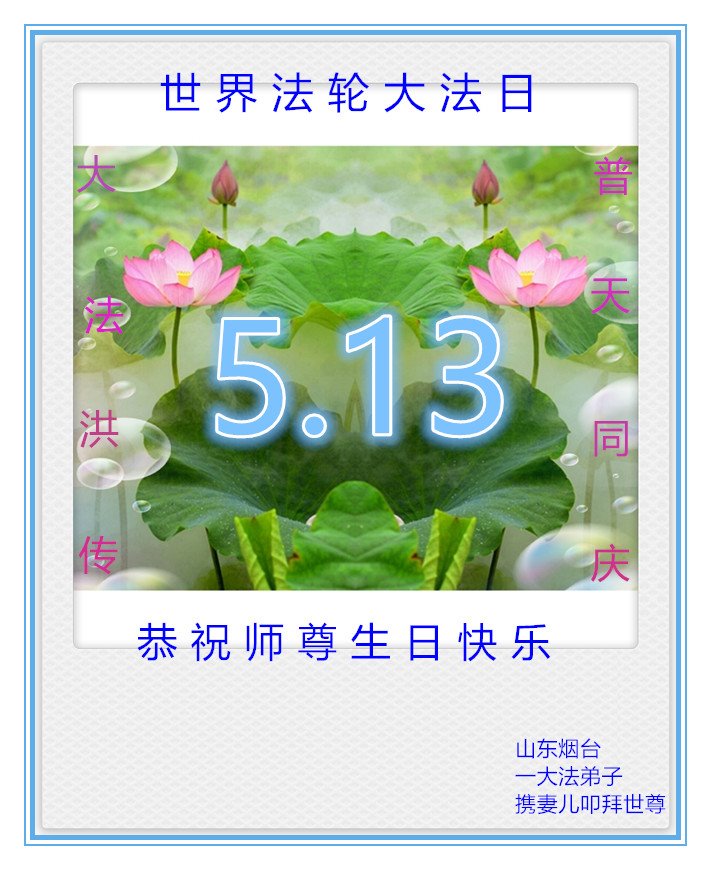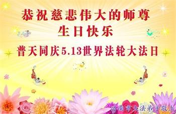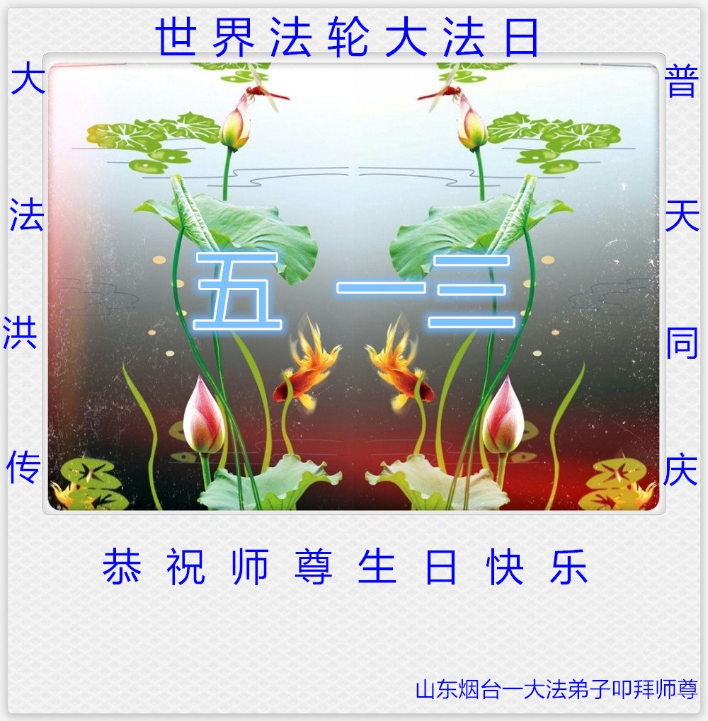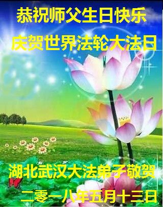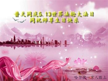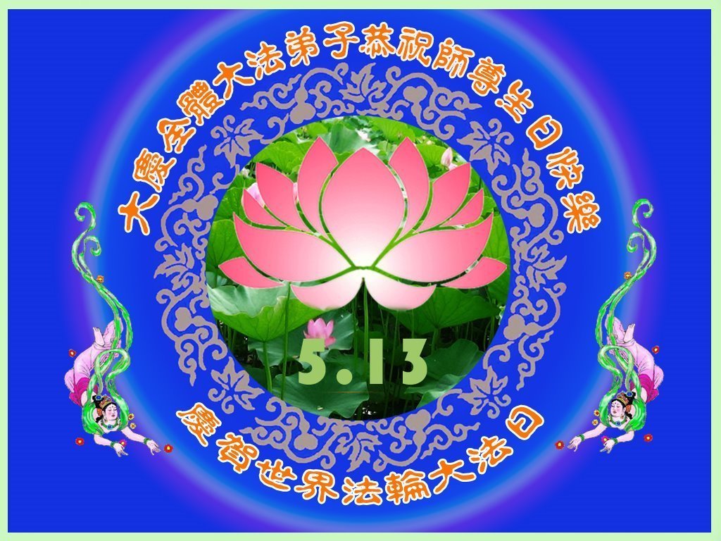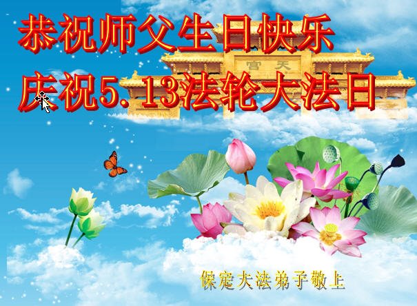 我们衷心恭祝李大师生日快乐!暨“五一三”世界法轮大法日。法轮大法是教人向善的正法正道。但在国内却无端遭受了近十九年迫害。祝愿法轮大法在新的一年更好的弘扬世界。我们相信正义的力量一定会终止这场迫害,让国内的大法弟子有更好的学法炼功环境,希望更多的世人明白大法真相,接受大法,有更好的未来,这一天也很快会到来。