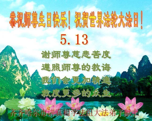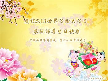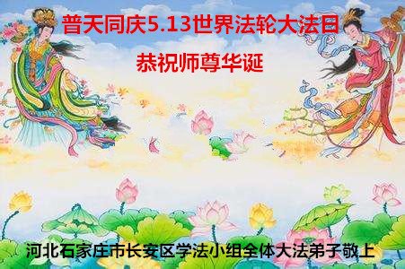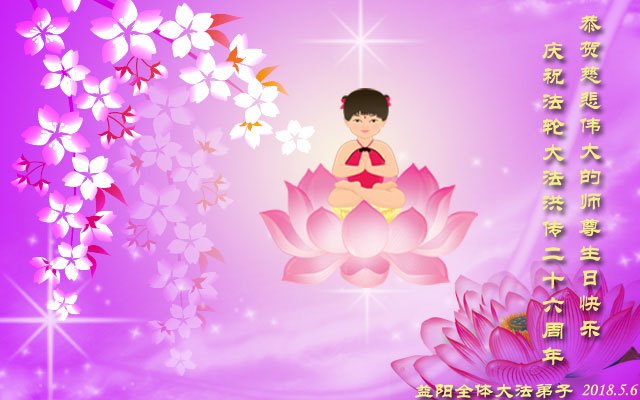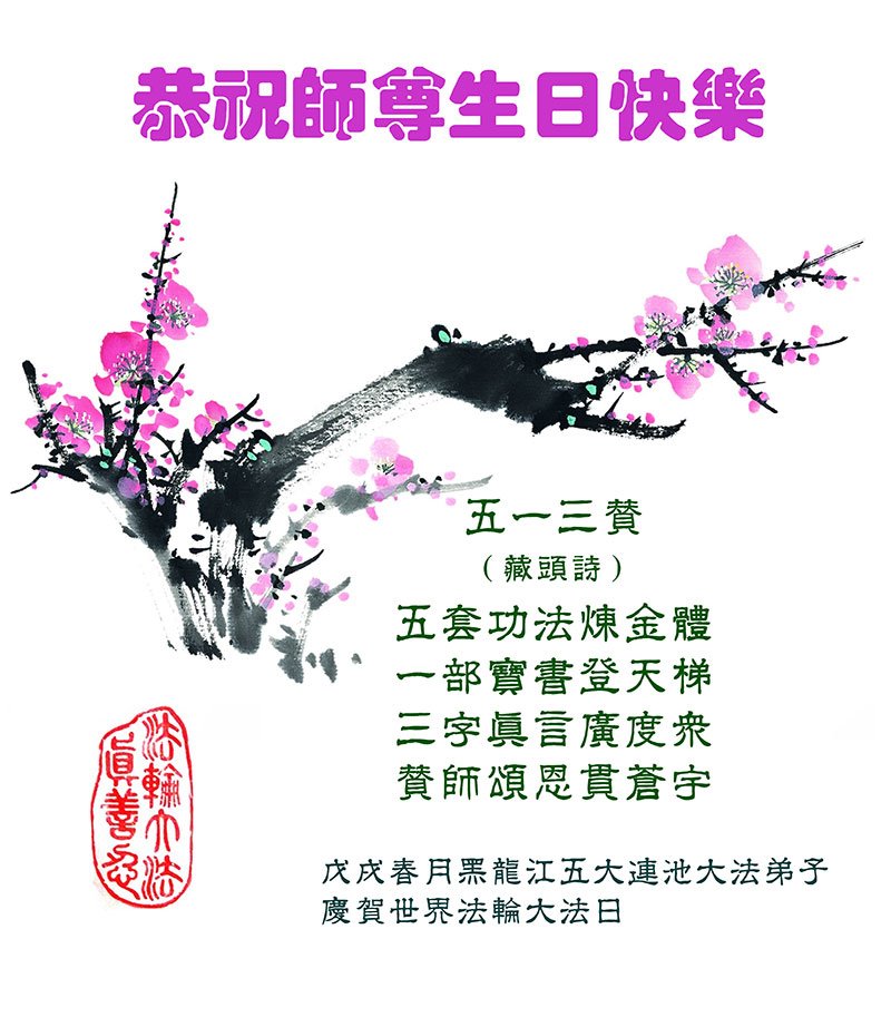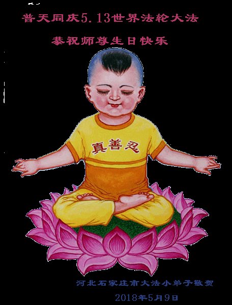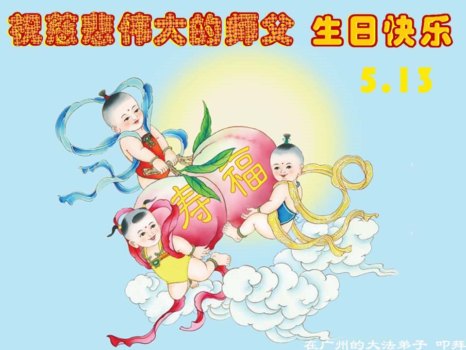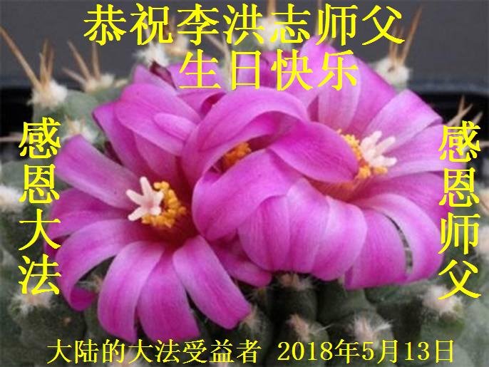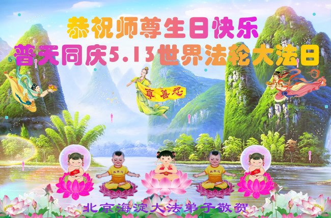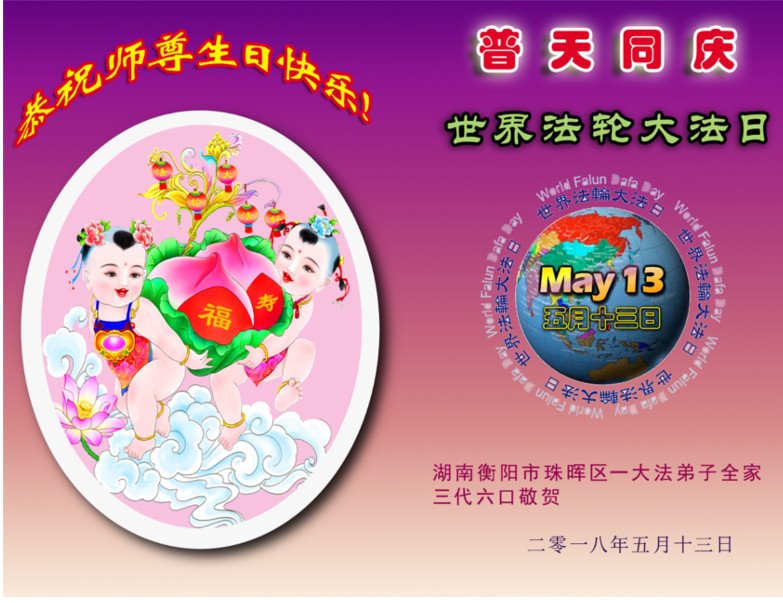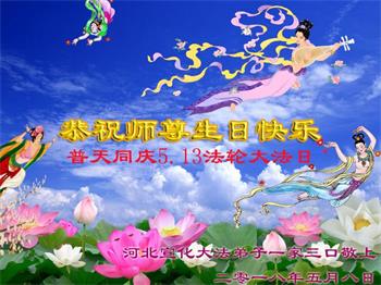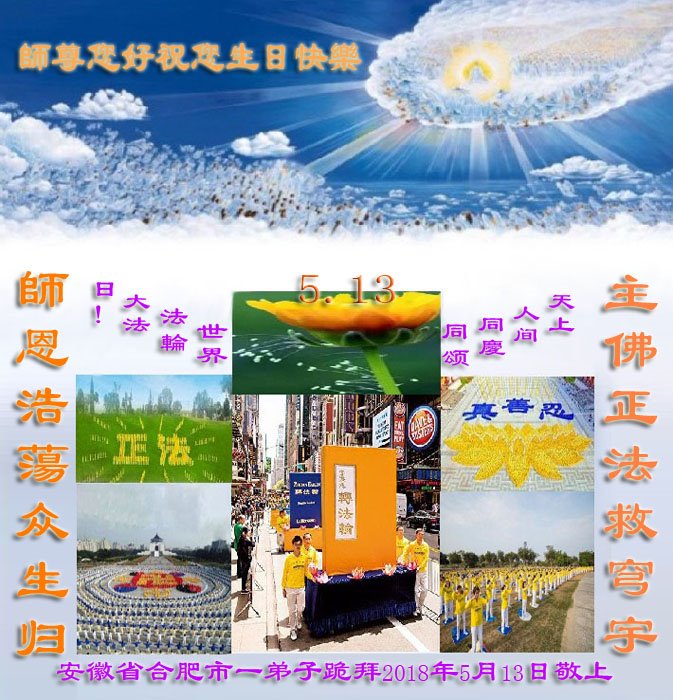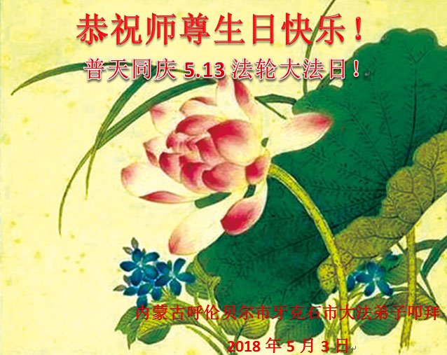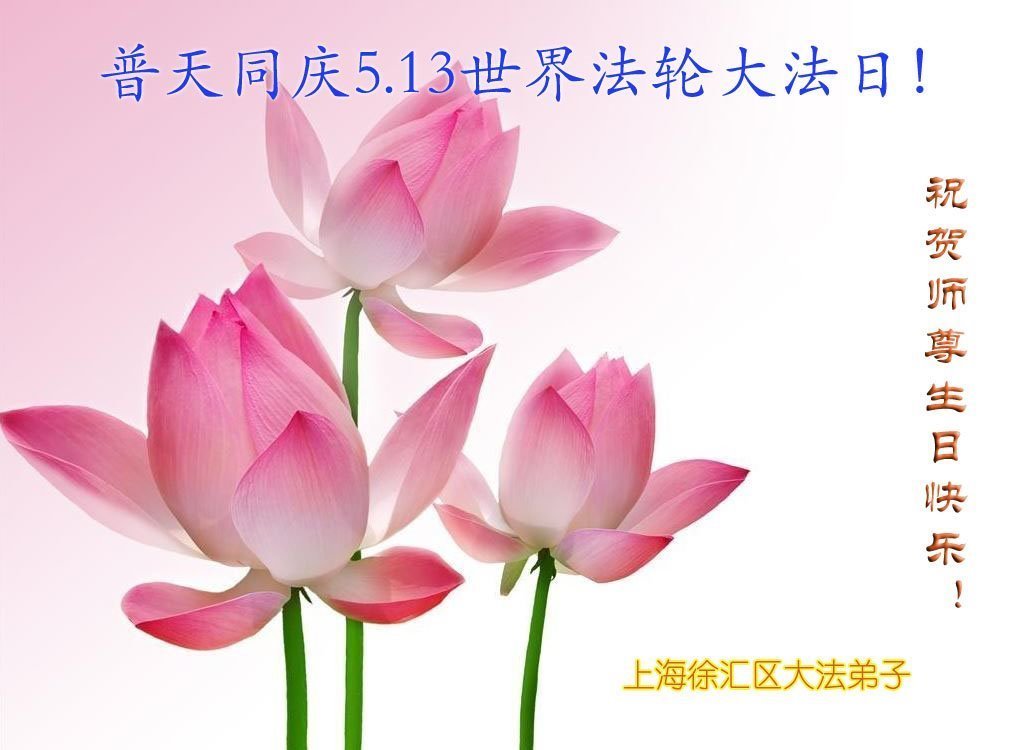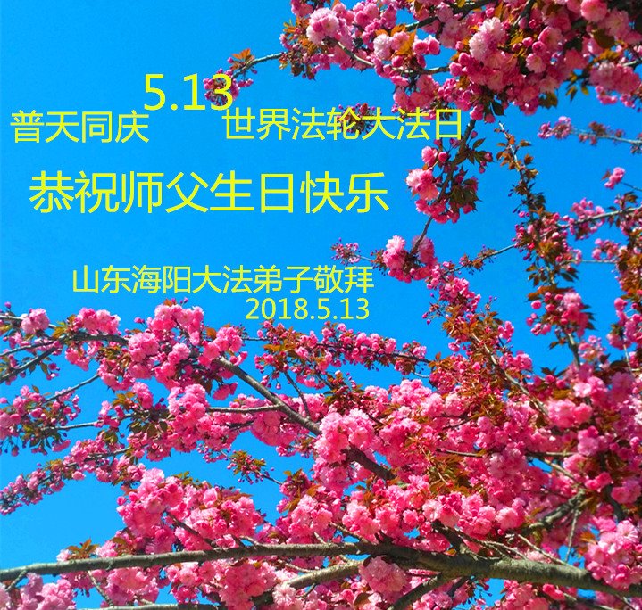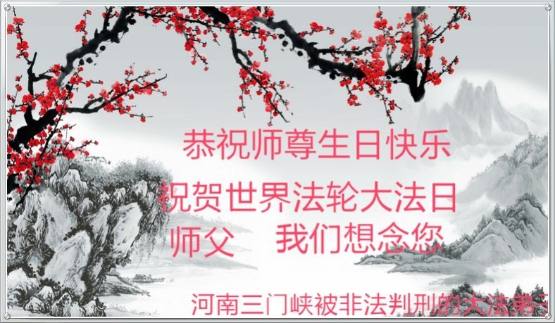 我们衷心恭祝李大师生日快乐!暨“五一三”世界法轮大法日。法轮大法是教人向善的正法正道。但在国内却无端遭受了近十九年迫害。祝愿法轮大法在新的一年更好的弘扬世界。我们相信正义的力量一定会终止这场迫害,让国内的大法弟子有更好的学法炼功环境,希望更多的世人明白大法真相,接受大法,有更好的未来,这一天也很快会到来。