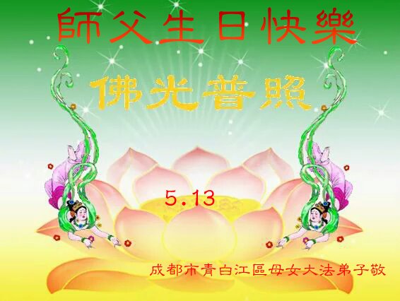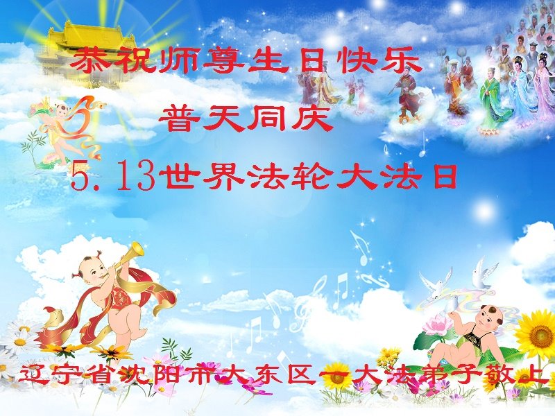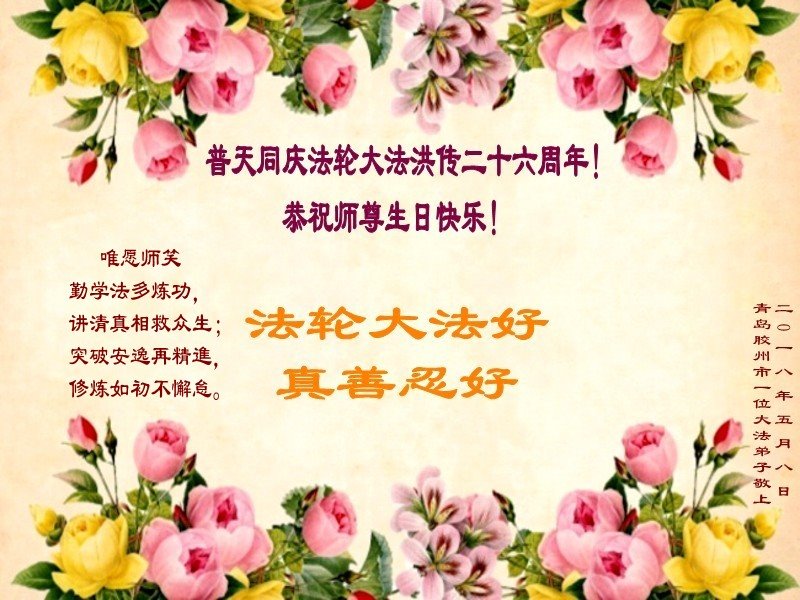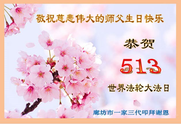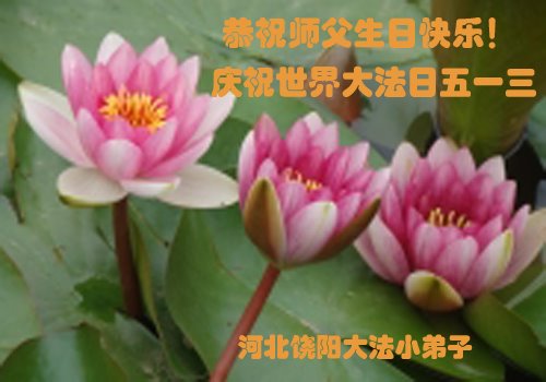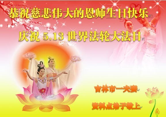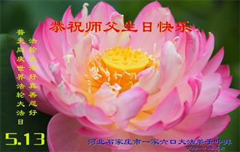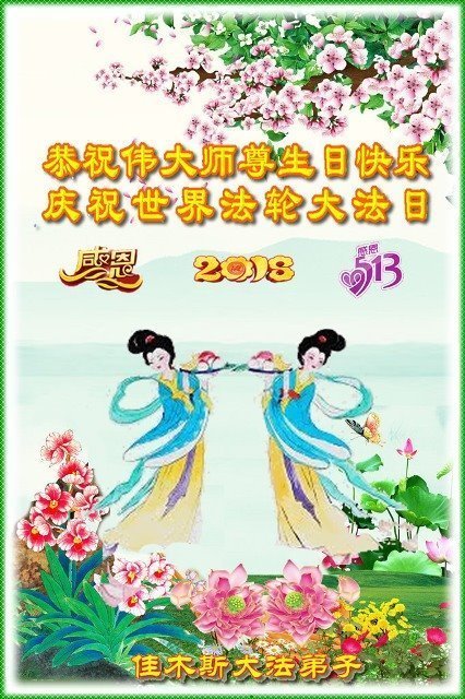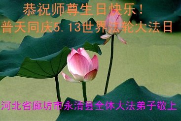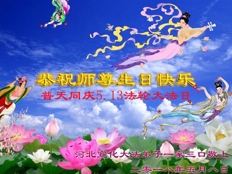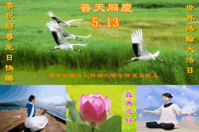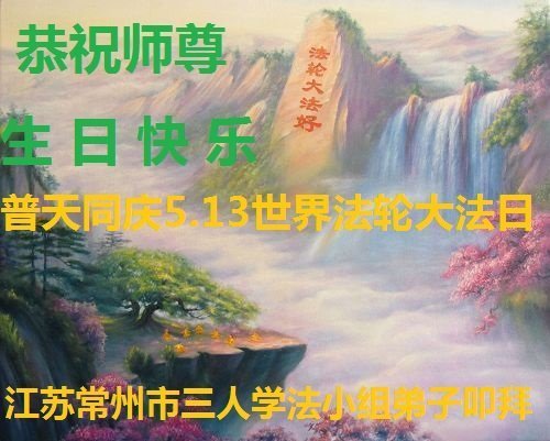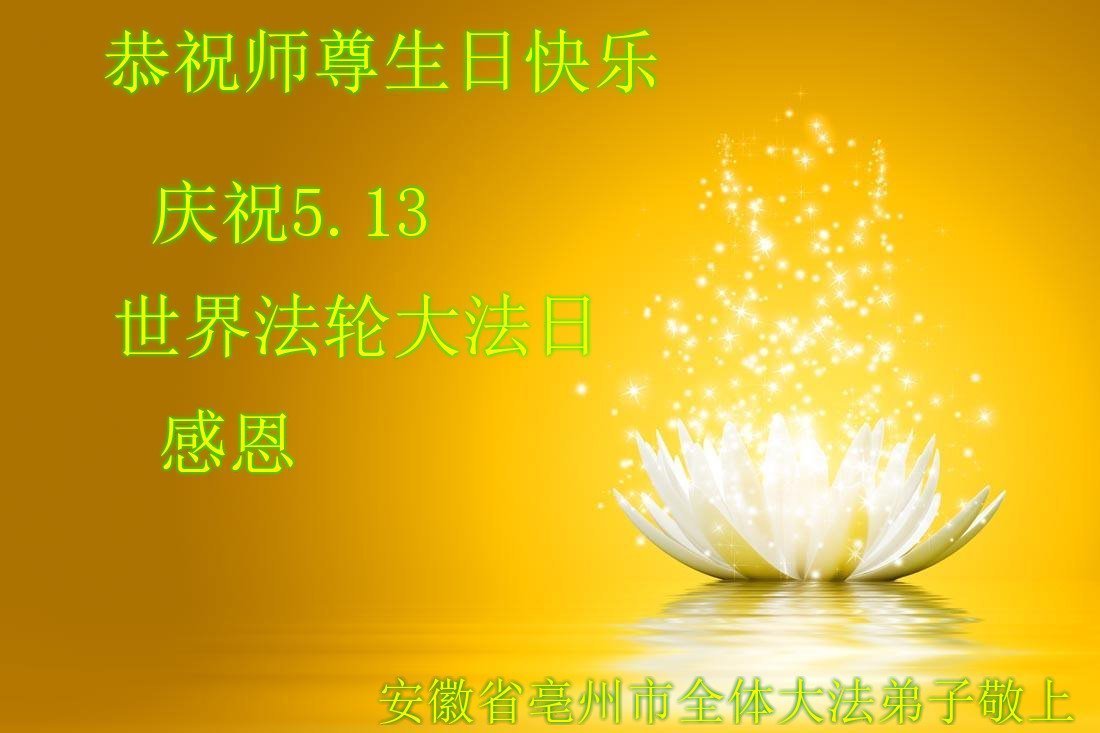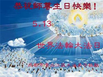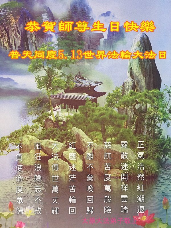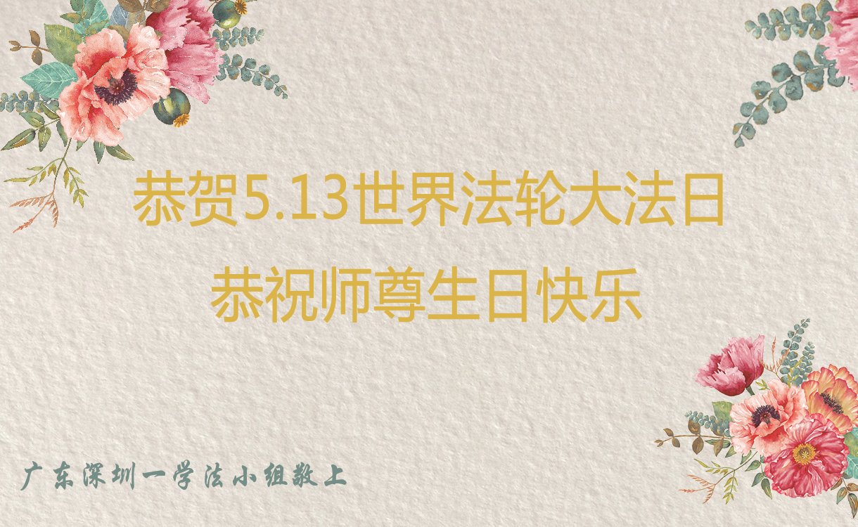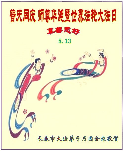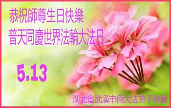 我们衷心恭祝李大师生日快乐!暨“五一三”世界法轮大法日。法轮大法是教人向善的正法正道。但在国内却无端遭受了近十九年迫害。祝愿法轮大法在新的一年更好的弘扬世界。我们相信正义的力量一定会终止这场迫害,让国内的大法弟子有更好的学法炼功环境,希望更多的世人明白大法真相,接受大法,有更好的未来,这一天也很快会到来。