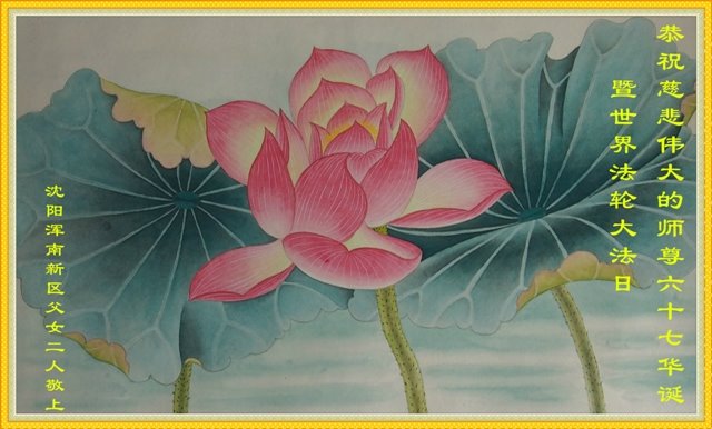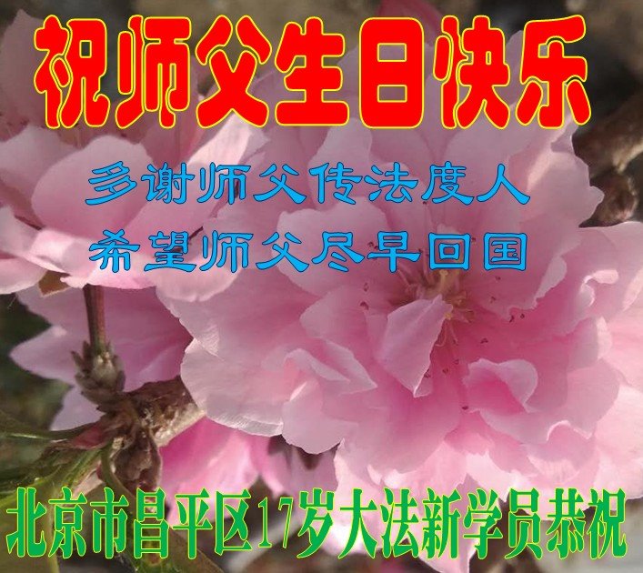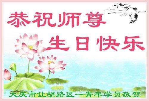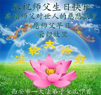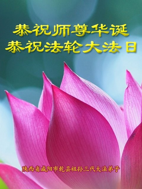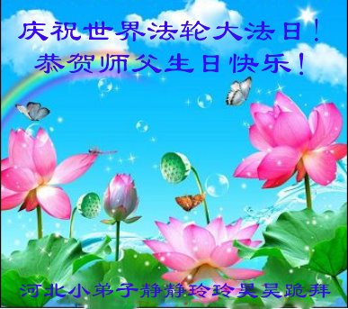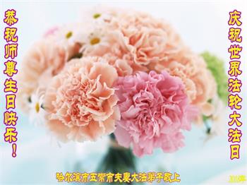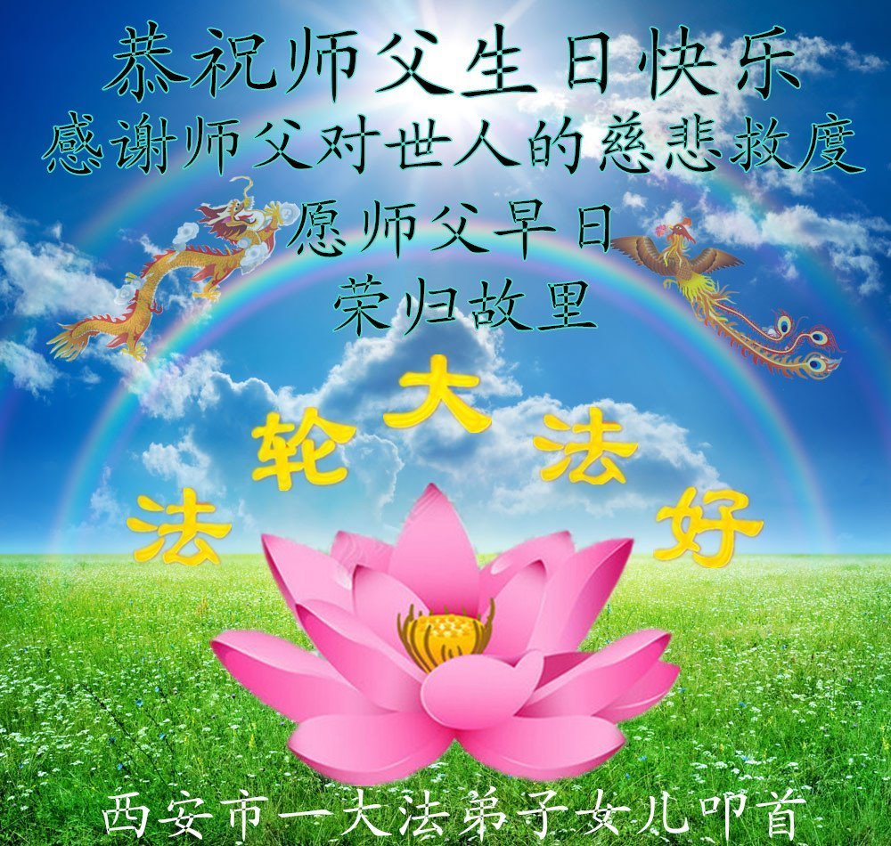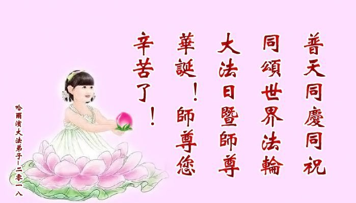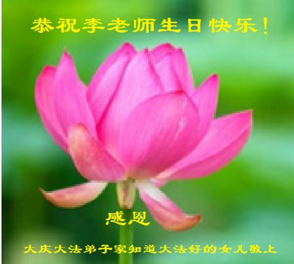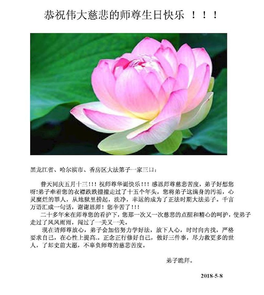 大法师父您好,您辛苦了,谢谢大法师父。送给我们拿千金万金都买不来的让我们能再一次重生的机会。您的大法徒冒着生命危险,不怕被抓,不怕坐牢,风雨无阻的给我们讲法轮功真相。使我们明白了大法的美好。了解了中共的邪恶,做了三退得以生命的永恒。大法师父的恩泽我们牢记心中。只有尽我们的一点微薄之利,顺应天意还您与大法清白。我身为大法弟子的家属,见证了中共邪党长达19年对法轮功学员的迫害过程。您为法轮功学员与家人所承受与付出的那份艰辛。我们感受到了您的慈悲与祥和。大法师父您辛苦了,在您生日喜庆的日子里,我代表我爸爸、妈妈、大姐、女儿祝您生日快乐!我会一如既往的承担家中的生活家务,支持妻子修炼,多救人,做她应该做的。谢谢您保护我们全家人。我们在大陆恭迎您早日回来的那一天。