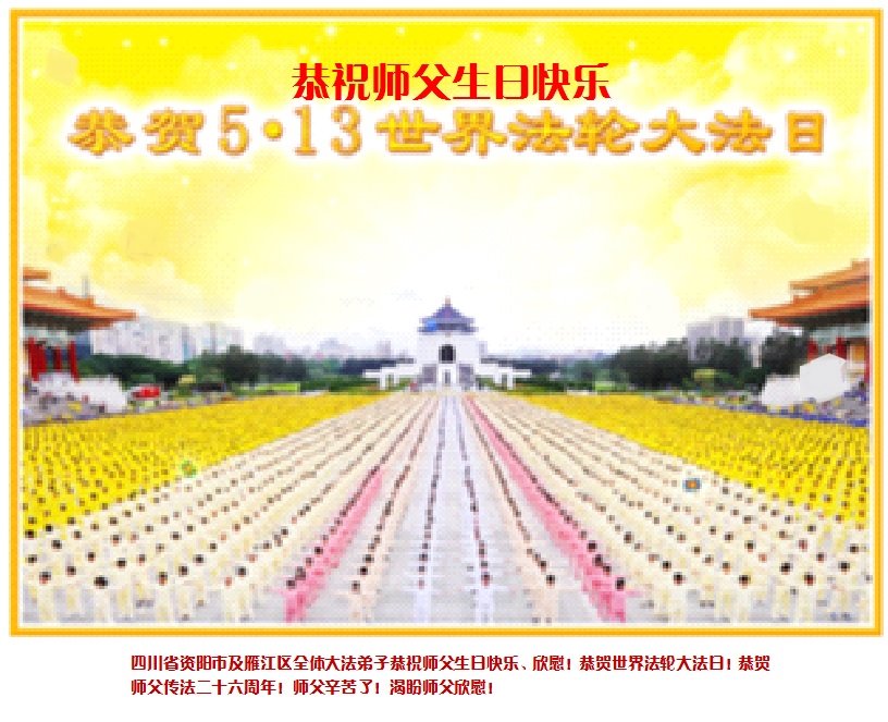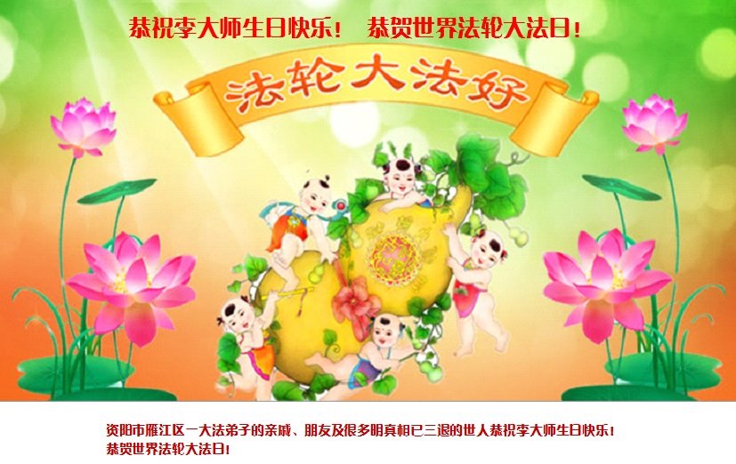 资阳市雁江区一大法弟子的亲戚、朋友及很多明真相已“三退”的世人恭祝李大师生日快乐!