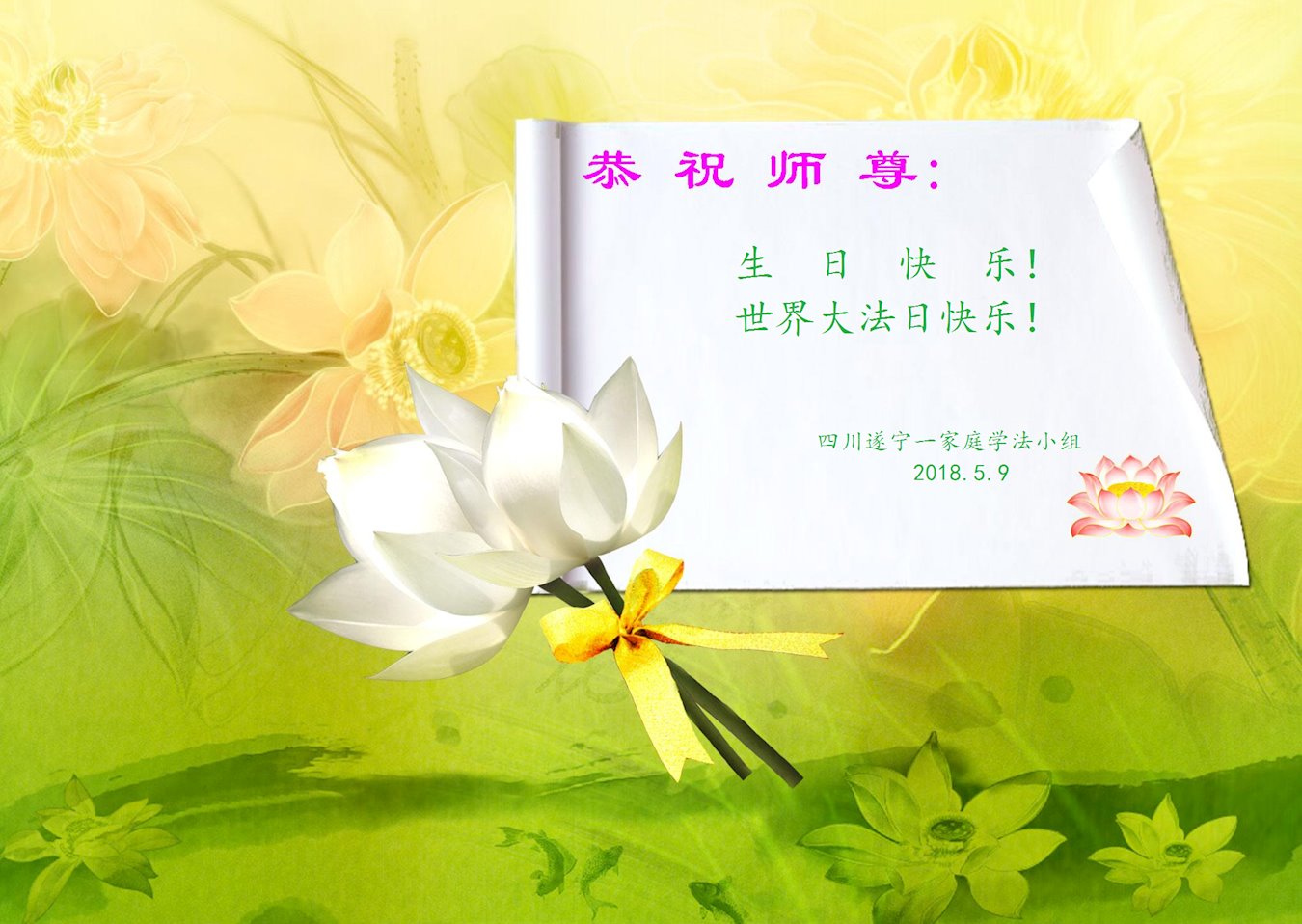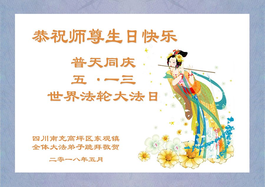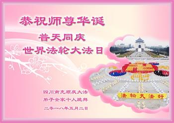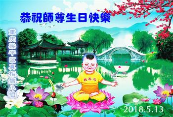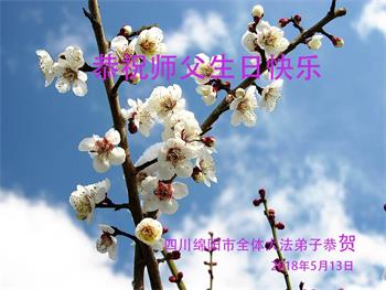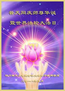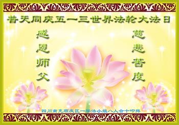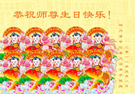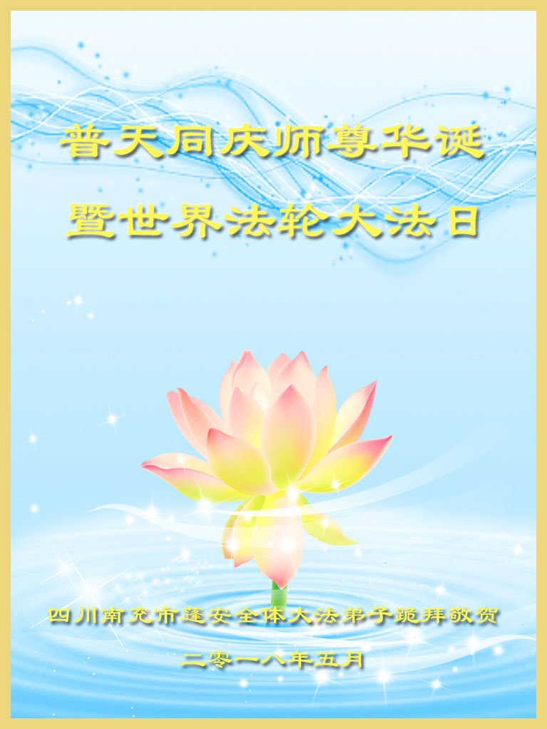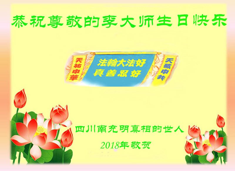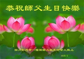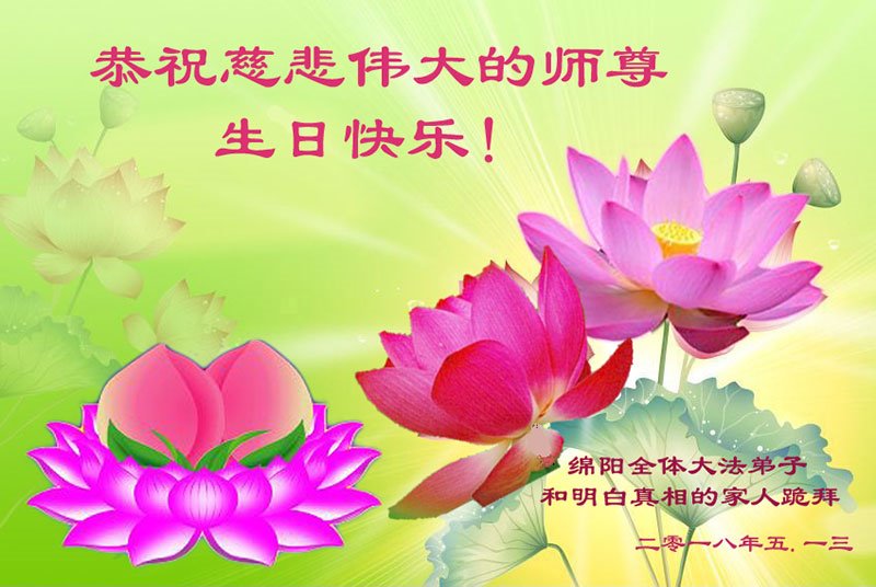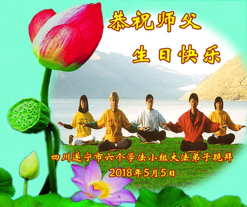 我们是遂宁市三名明真相的世人,在李洪志大师生日到来之际,我们衷心祝愿李大师生日快乐!万事如意!并祝李大师身体健康、长命百岁,同时感谢李洪志大师和法轮大法对我们的慈悲救度之恩!我们每天都在诚心敬念“法轮大法好、真善忍好”!希望李大师早日回到中国,这是我们每一个得到您救度的世人的共同心愿。