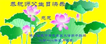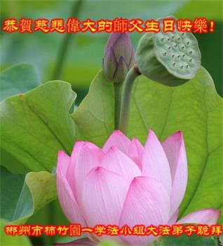 伟大的法轮佛法,于这座福城迅速传播,人传人,心传心,祛病健身的奇效,道德升华的奇迹,享誉湘南大地。骨癌患者幸遇法轮佛法,重获新生;桂东县南边村的村民幸遇法轮佛法,成就了一段由抢水到让水的历史佳话;许多的郴州百姓幸遇法轮佛法,踏上了返本归真的成神之路。即使历经风雨的洗礼,法轮佛法仍然深深扎根于这块美丽的土壤,成为众多法轮功修炼者心中的指明灯。这块土地上的法轮功修炼者时刻谨记恩师的殷殷教诲,用自己的言行,温暖身边无数有缘的众生。未来的路,我们继续前行,谨遵恩师的教诲,志虑忠纯,做好三件事,兑现史前的誓约。最后,我们郴州市全体大法弟子向恩师道一声,您辛苦了!师父,谢谢您!祝您生日快乐!