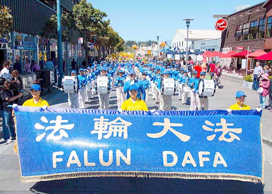五月十二日,美国旧金山法轮功学员在渔人码头旅游景点游行,恭祝师父华诞,庆祝“世界法轮大法日”,传递真、善、忍的美好。