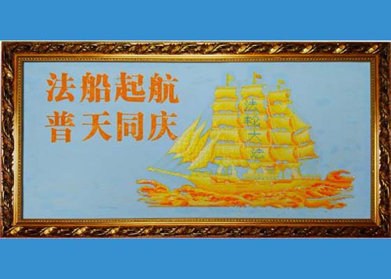 钻石画是设计者把闪烁的人造水晶平底圆钻(有的是方钻)和设计的图案有机的结合在一起完成的作品。本幅作品象征大法救度众生,法船起航,普天同庆。