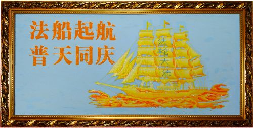 注:钻石画是设计者把闪烁的人造水晶平底圆钻(有的是方钻)和设计的图案有机的结合在一起完成的作品。本幅作品象征大法救度众生,法船起航,普天同庆。