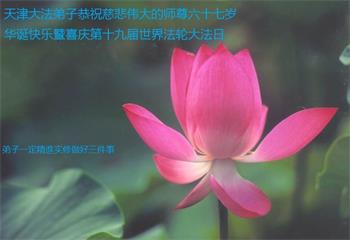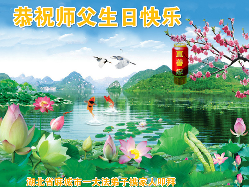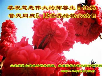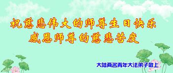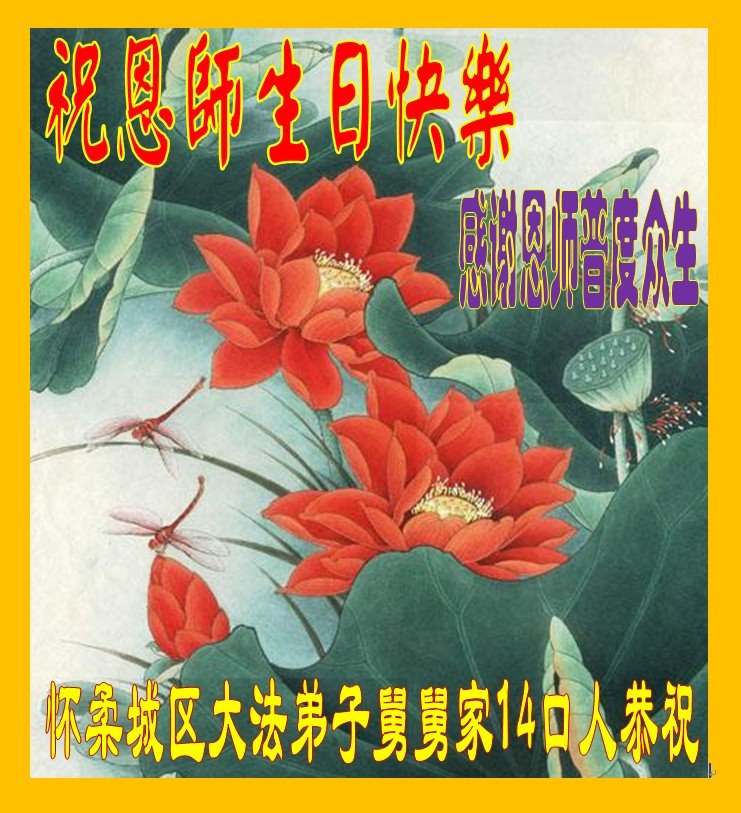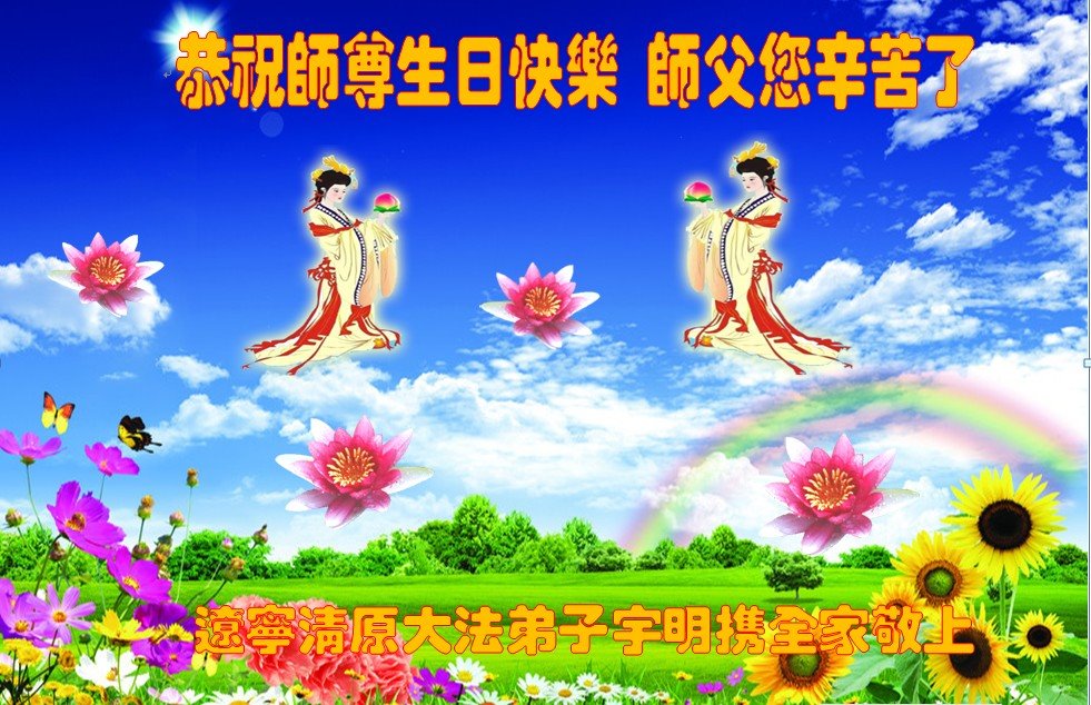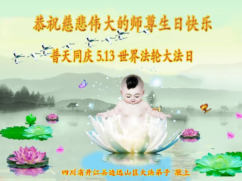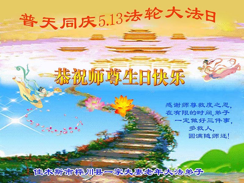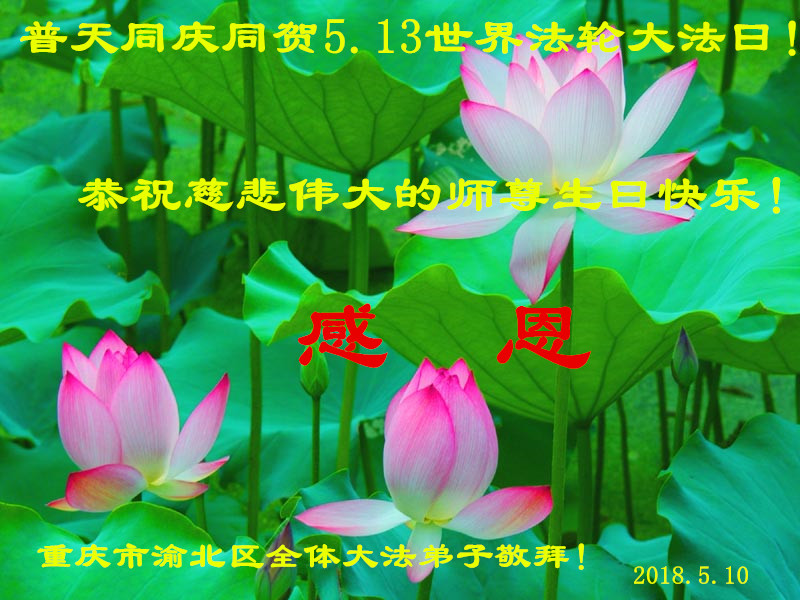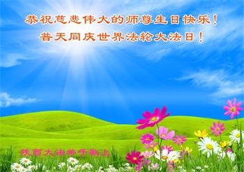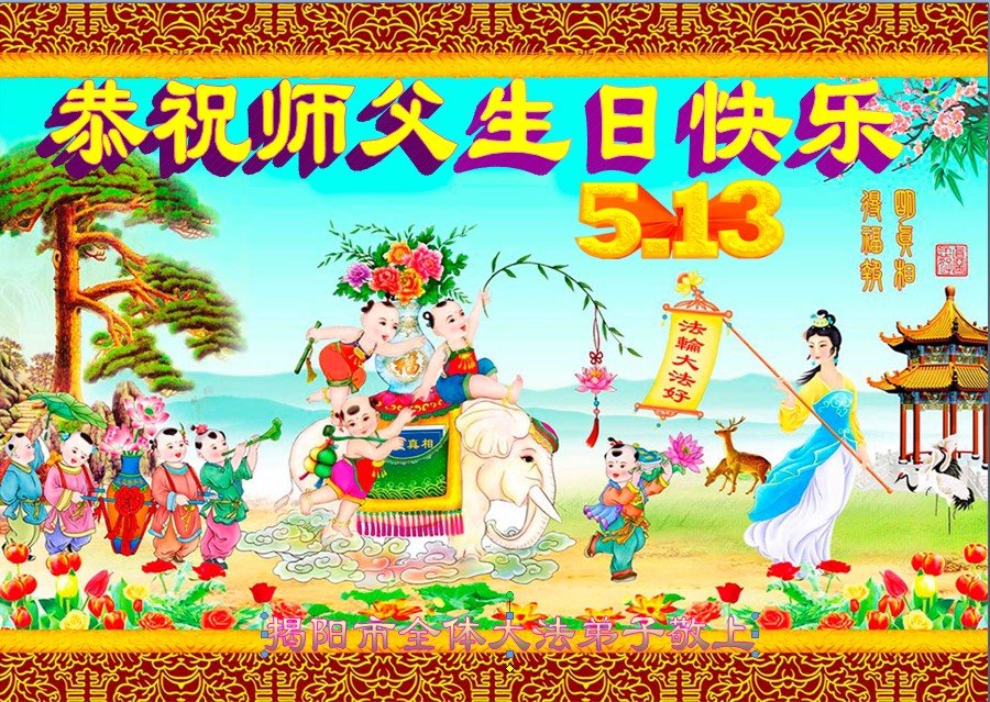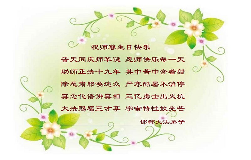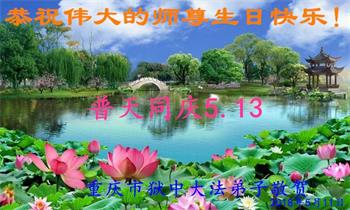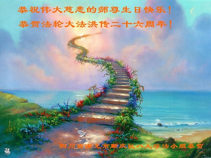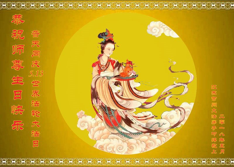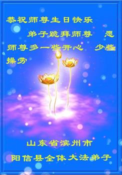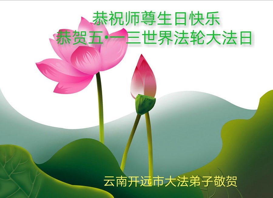 我们深谢恩师慈悲苦度!衷心恭祝师尊华诞快乐!在正法最后不多的时间里,我们一定会认真学好法,修好自己,从根本上改变常人的观念,正念正行,抓紧时间救度更多众生,完成正法时期大法弟子的历史使命,圆满跟随师尊回归家园。