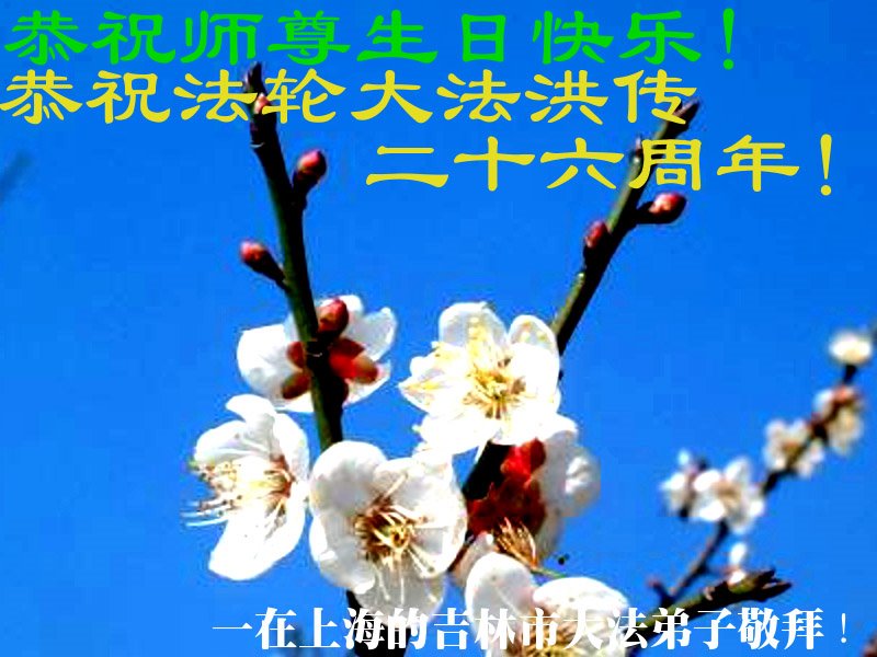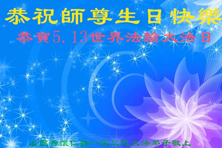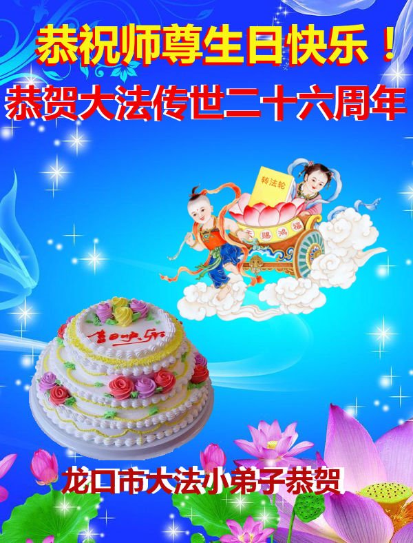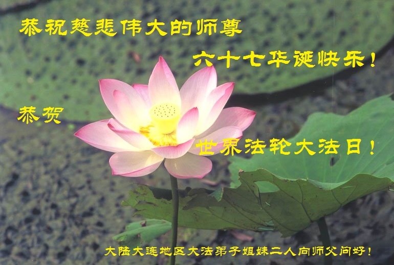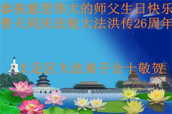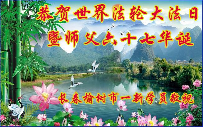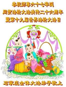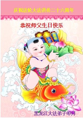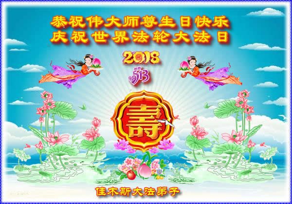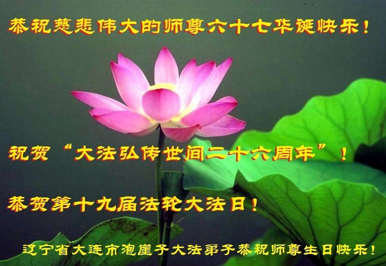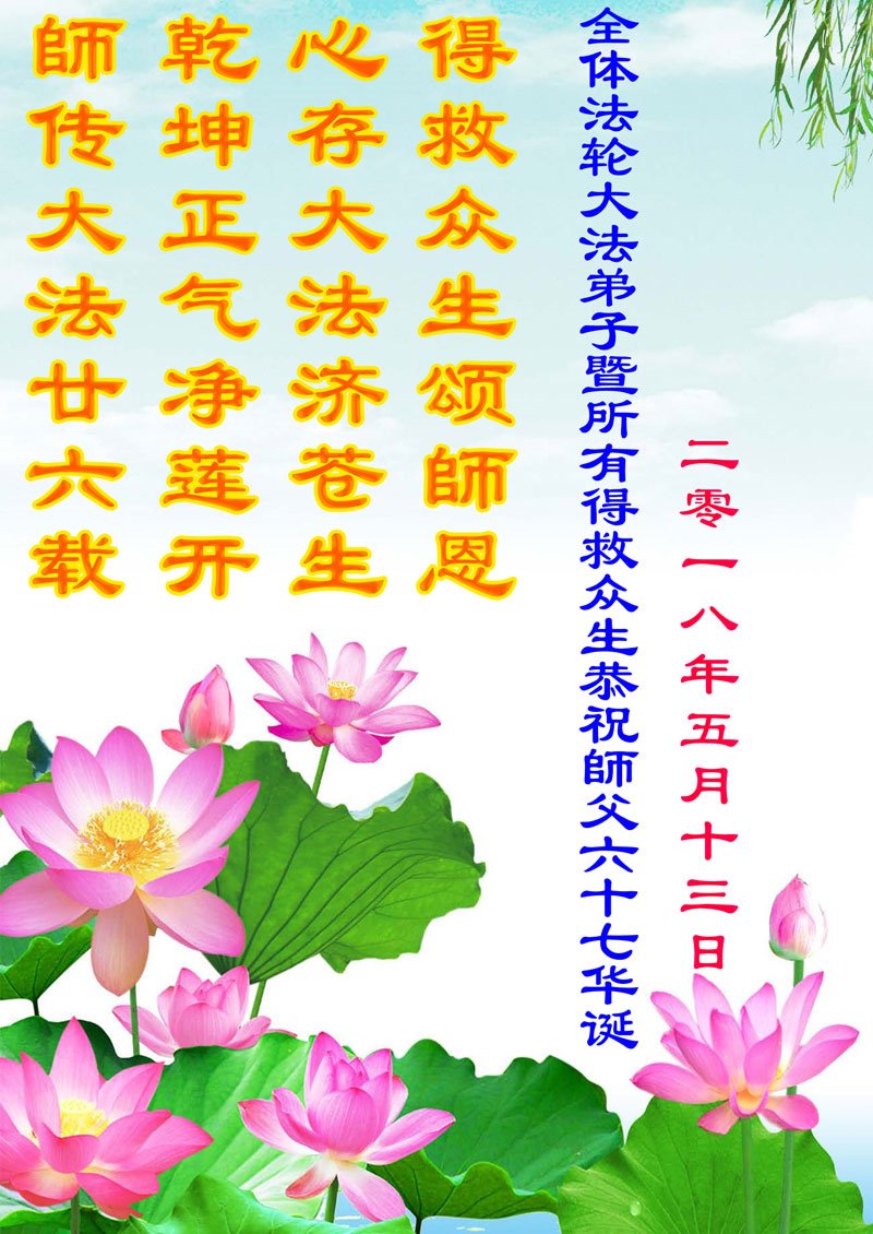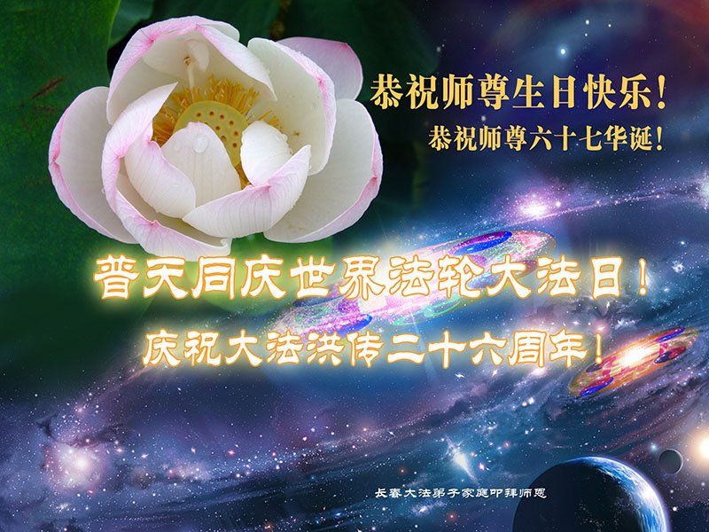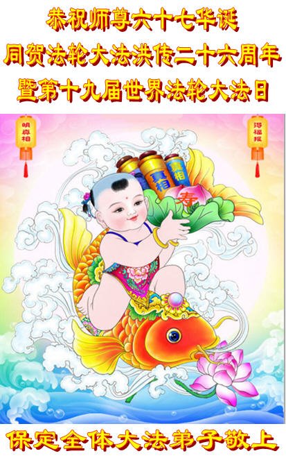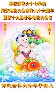 在这个特殊的日子里,天上人间,普天同庆,海外的法轮大法弟子给师父发来贺词,恭祝师父六十七岁华诞,恭贺师父传法二十六周年,同贺世界法轮大法日!