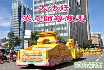 游行队伍由三大主题组成:“法轮大法好”、“停止迫害法轮功”、“声援三亿多中华儿女退出中共党团队”,展现了法轮大法的美好和中共的残酷迫害及远离邪恶得福报的三退大潮。打头阵的是由两百名法轮功学员组成的天国乐团,他们步伐整齐,紧随其后的是法轮功著作《转法轮》的中英文版的巨型书模,功法展示队、送福小花船队、彩旗队、横幅队、腰鼓队等依次亮相。法轮功学员打出“爱国≠爱党”、“中国≠中共”、“法办江泽民”等横幅,传递着关乎每个中国人未来的信息,希望中国人为自己生命做出正确的选择。