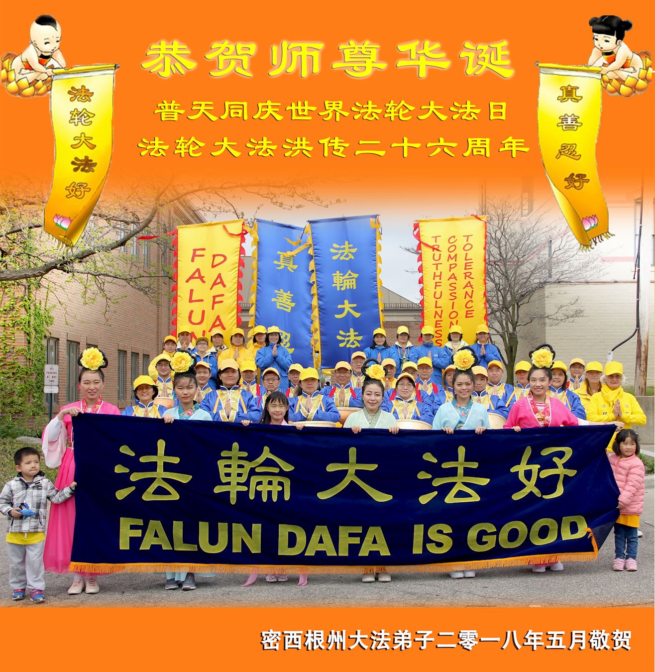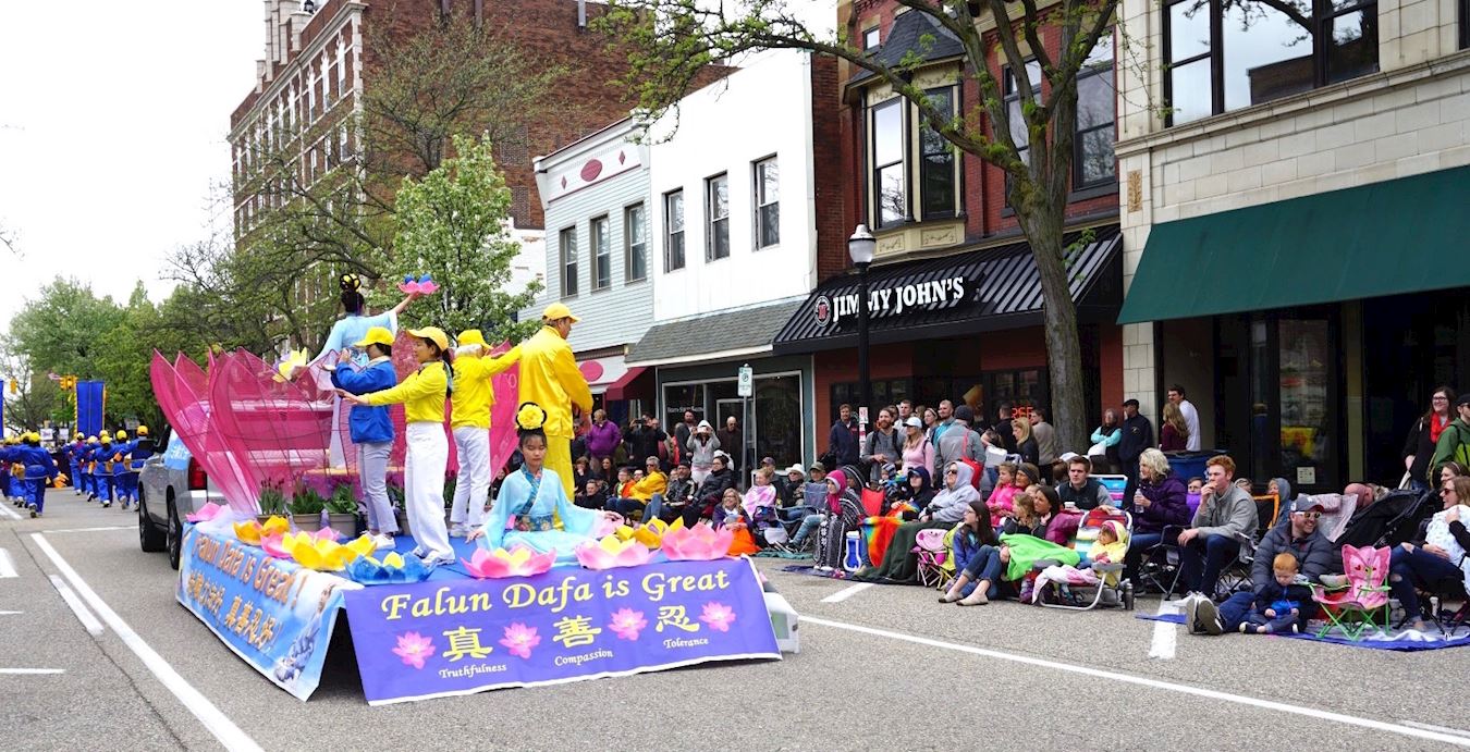 二零一八年第八十九届国际郁金香节(Holland's Tulip Time Festival)从五月五日开始。作为密西根州规模最大,最壮观的游行之一,压轴游行在五月十二日由军乐队游行(Bands Parade)和音乐游行(Muziek Parade)组成,在荷兰市中心的街道上举行超过两英里的庆祝活动,吸引了超过二十五万名现场观众。密西根法轮大法学会首次参加了本次压轴的音乐游行,在花海中,密西根州和加拿大温莎市的法轮功学员们把法轮大法的美好传递给现场观众,并借此庆祝法轮大法洪传世界二十六周年。
