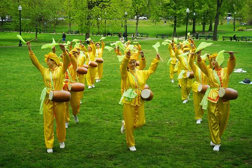 波士顿法轮功学员于五月十三日在波士顿公园以集体炼功、腰鼓表演、唱谢师恩,把大法的美好展现给世人;同时庆祝“世界法轮大法日”暨恭贺师尊华诞。