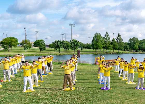 五月十三日,美国达拉斯-沃斯堡地区的法轮功学员聚集在布兰诺市Russell Creek公园集体炼功,庆祝法轮大法洪传世界二十六周年。
