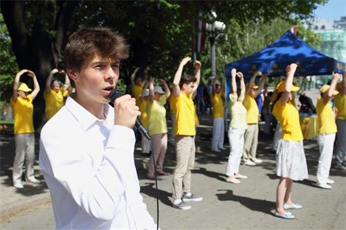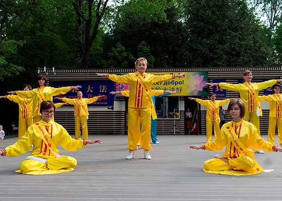 为庆祝法轮大法洪传世界二十六周年,莫斯科法轮功学员在菲利公园载歌载舞与民众共同庆贺。腰鼓声阵阵为当天的活动拉开了序幕,舞龙舞狮更让民众欢喜不已。