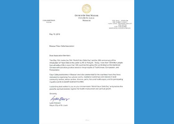 五月十日圣路易市市长致信密苏里州法轮大法学会,为庆祝“世界法轮大法日”及修炼这一令人身心受益、平和的功法献上最美好的祝愿。