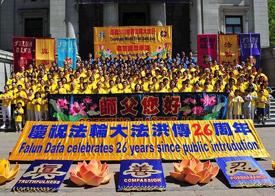 5月13日,法轮功学员及其支持者在温哥华市中心艺术馆前广场举行庆祝活动,庆祝法轮大法传世26周年暨第19届世界法轮大法日,表达对大法师父的感恩。