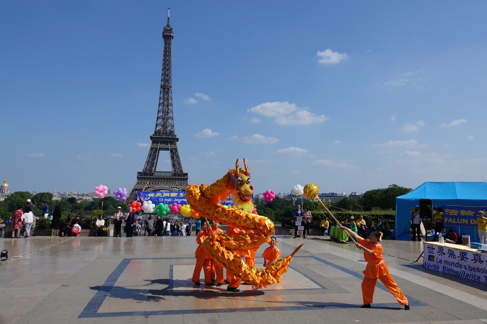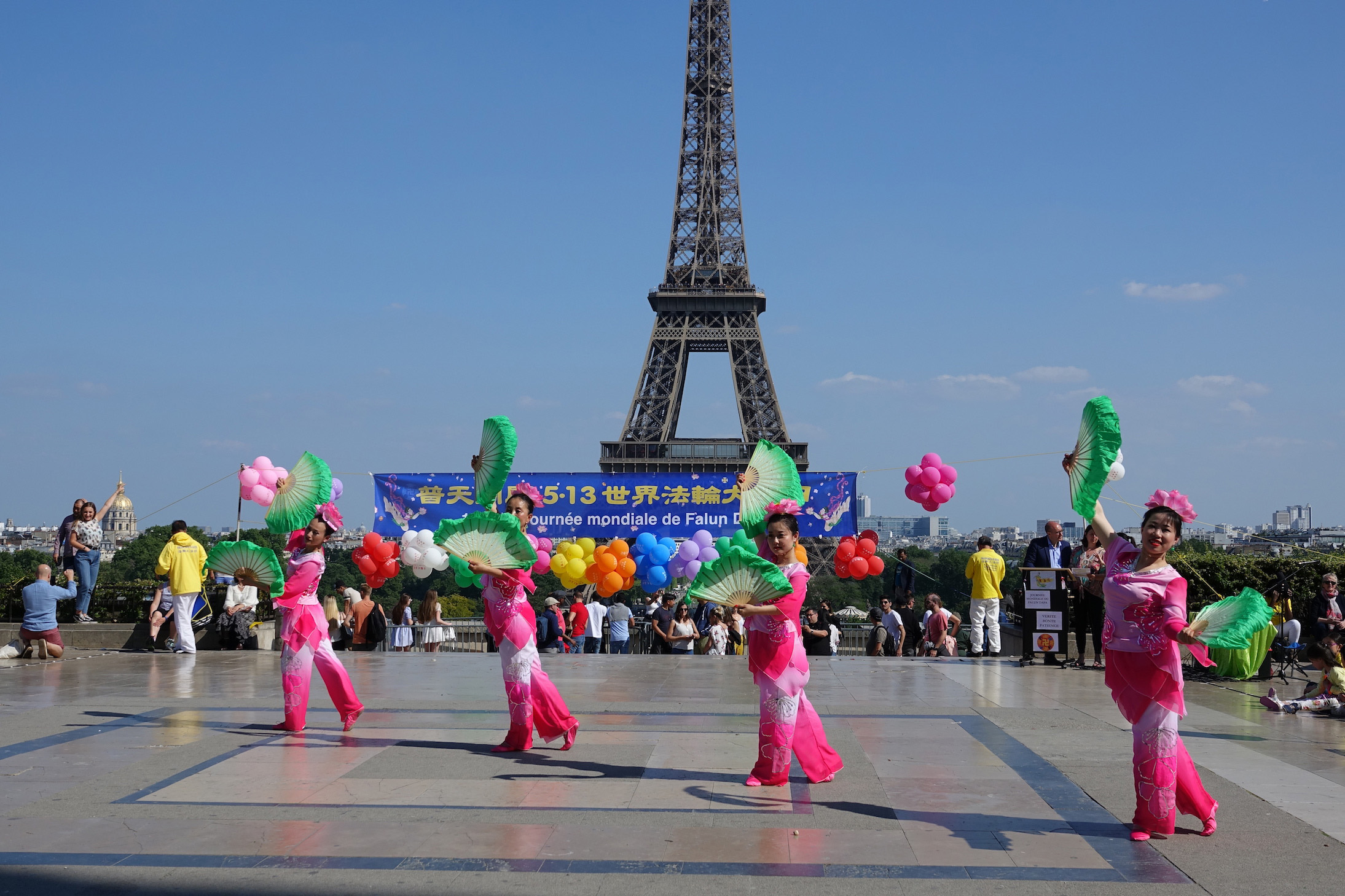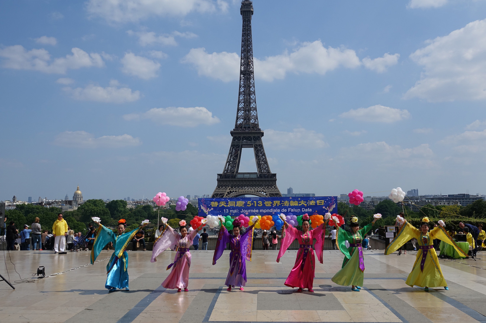 五月二十日在法国巴黎铁塔对面的人权广场上,法国法轮功学员们用歌舞演出和功法演示向过往的游客和法国民众传递大法的美好,同时也告诉人们正在中国发生的对大法修炼者的迫害,呼吁制止迫害。