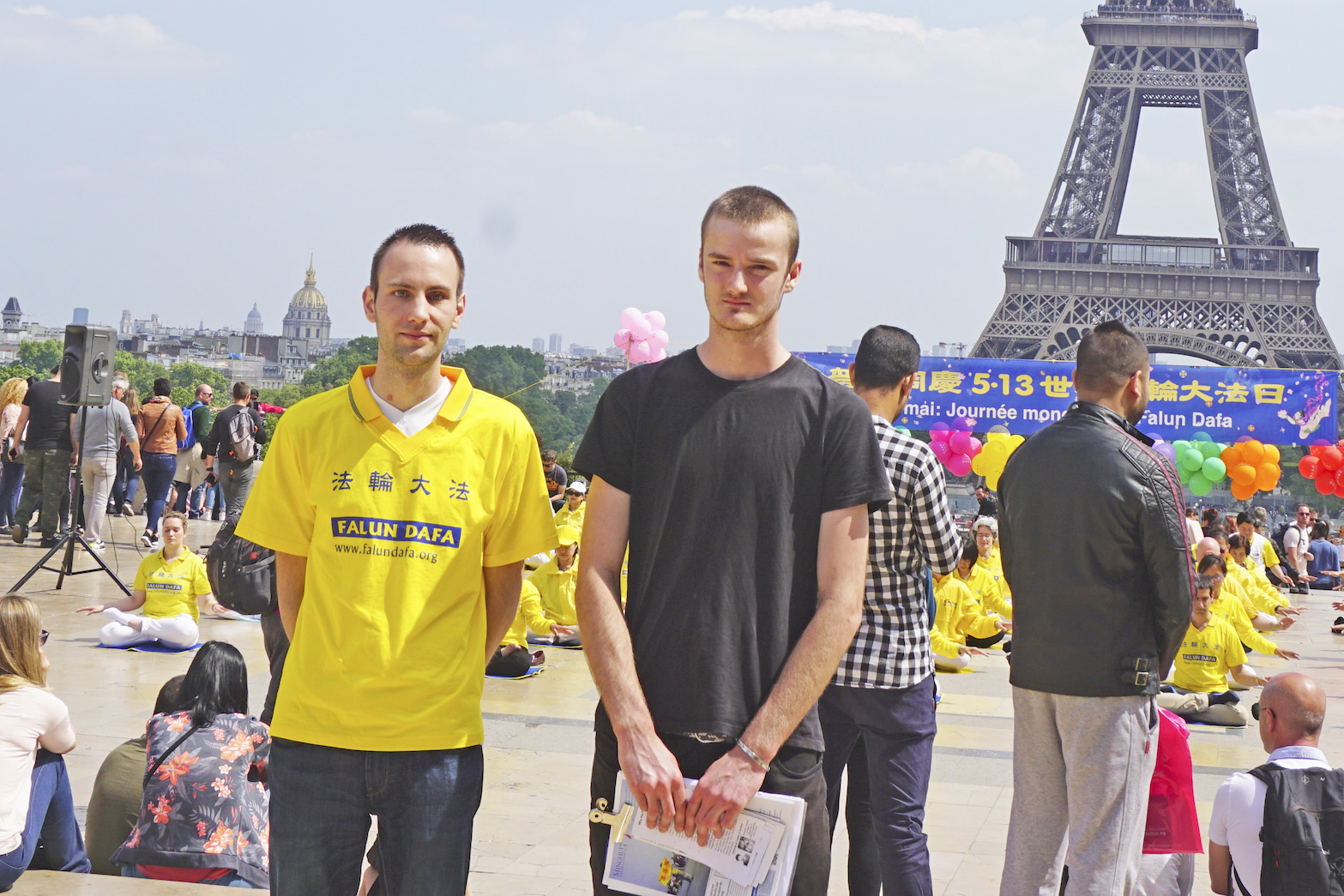 ![]() 图15:法轮功学员吉佑姆(Guillaume)(左)和阿克赛尔(Axel)(右)表兄弟在巴黎人权广场参加庆祝世界法轮大法日活动。 |