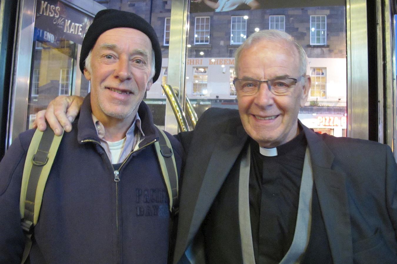 ![]() 图8:五月二十一日,神父詹姆斯·利德尔(James Liddle)先生(右)观看了神韵纽约艺术团今年在爱丁堡的最后一场演出。 |