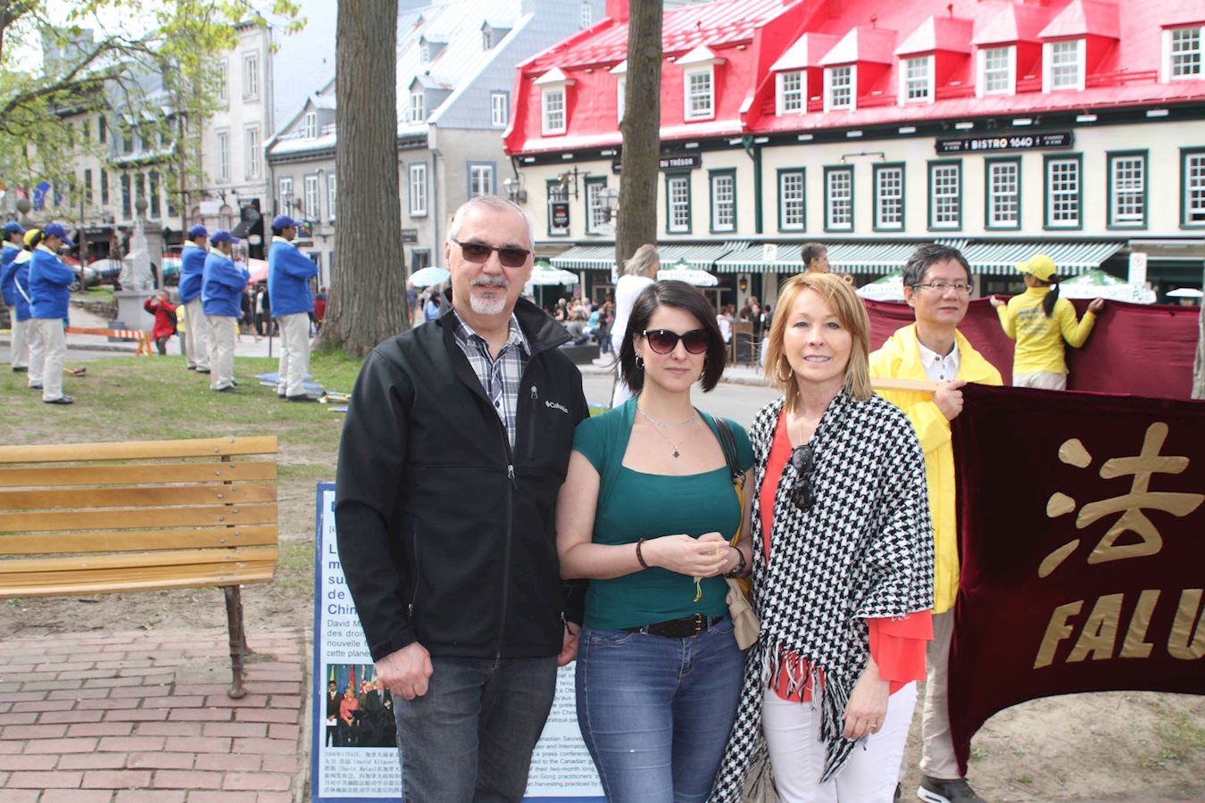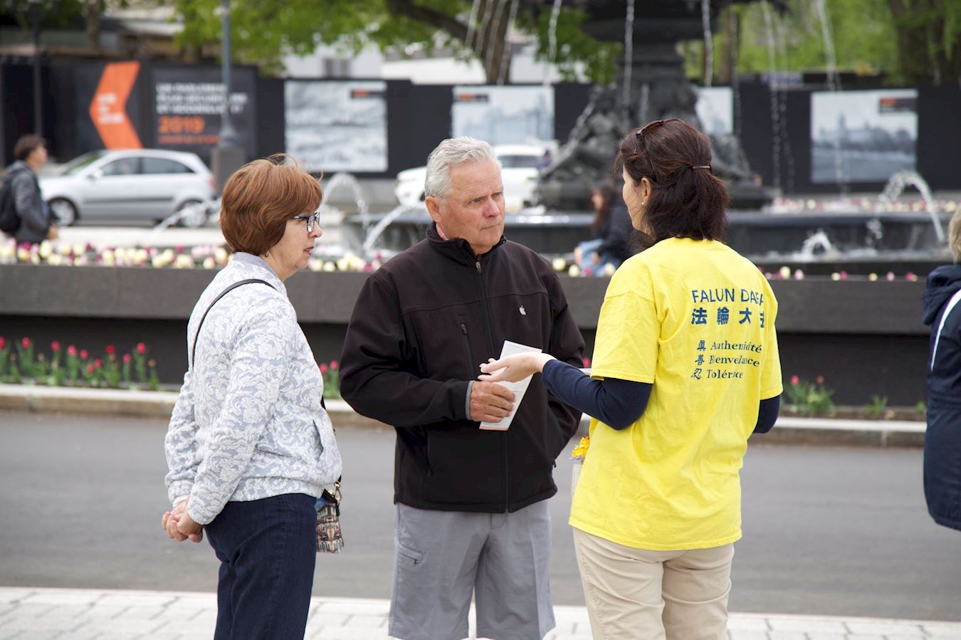 三位伊朗族裔的中年女士,站在活动场地前认真地听西人学员讲真相,其中的一位是一个协会里的负责人,据她本人介绍目前她这个协会里有六百多个成员。她明白了真相后,特别是得知中共活摘法轮功学员器官的罪恶时,对中共的残暴行径很是气愤。于是她现场就采访了一位西人学员,然后把这个现场采访的视频直接通过社交媒体传给了她协会里的全体成员。另外那两位女士对这个舒缓、祥和的功法很感兴趣,询问了很多有关法轮功的详细信息,表示要学炼法轮功。