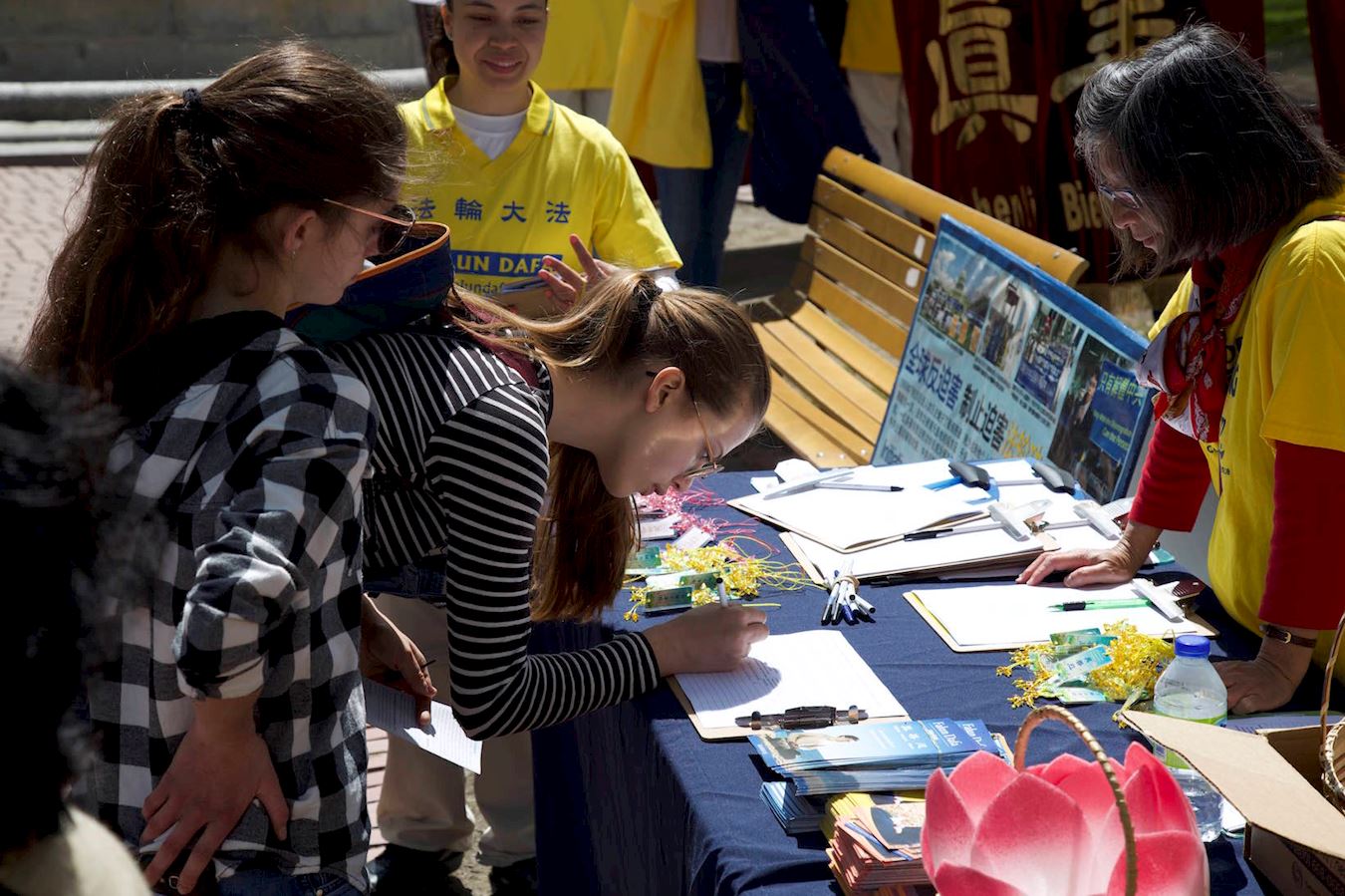 舞台旁边设有桌椅板凳,同时举办“和平的花瓣”活动和征签。民众纷纷签名支持法轮功学员反迫害,有的人现场就和学员学炼起功法动作来。