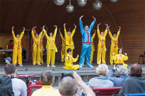 在公园的主要舞台上,主持人向大家介绍了法轮功是什么、弘传世界的盛况,学员们展示了法轮功的五套功法动作,同时也谈到了法轮功学员在中国遭到的残酷迫害。同时在舞台上载歌载舞,表演了“法轮大法好”、“纯洁的莲”、“仙笛”和扇子舞等舞蹈,赢得了阵阵掌声。腰鼓表演、舞龙舞狮更是受到观众的欢迎。