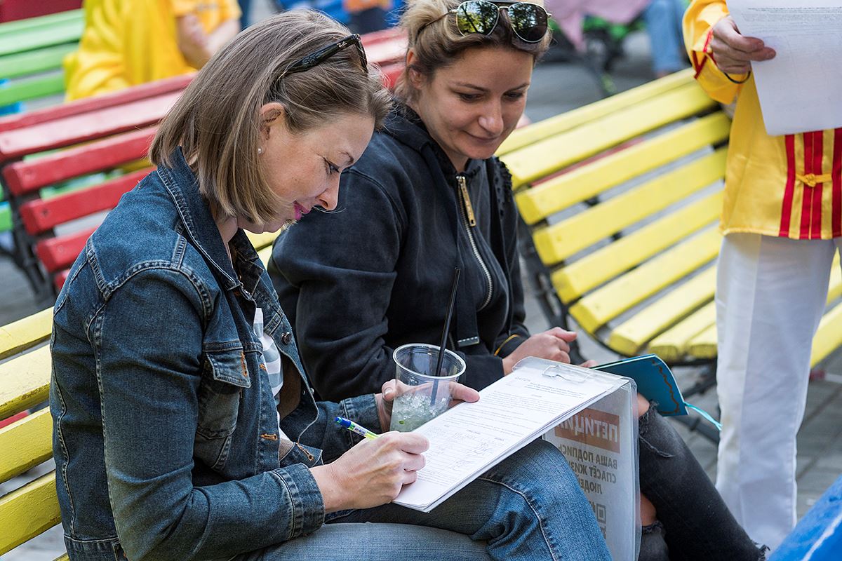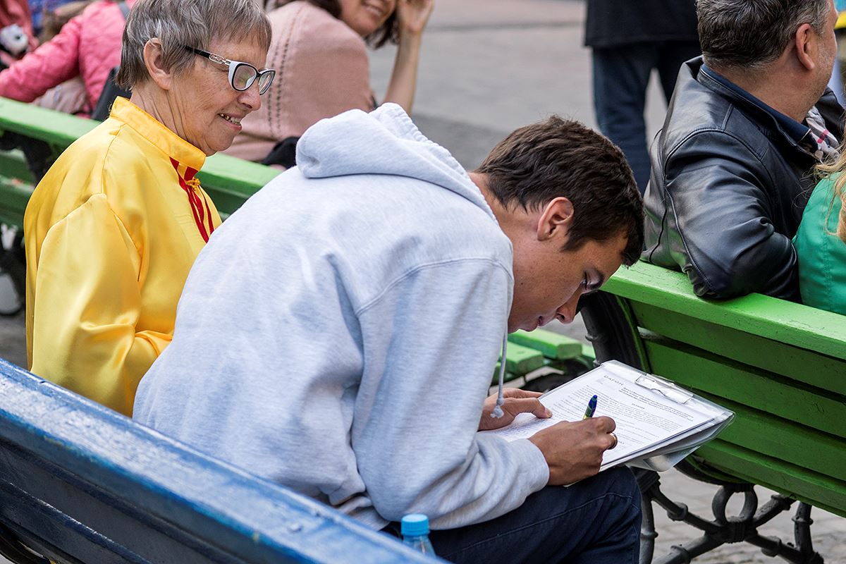 还有一对来自法国的夫妇,了解了真相后,得知可以用签名这种方式支持反迫害很是高兴,夫妻俩直接走上前去签名声援反迫害。