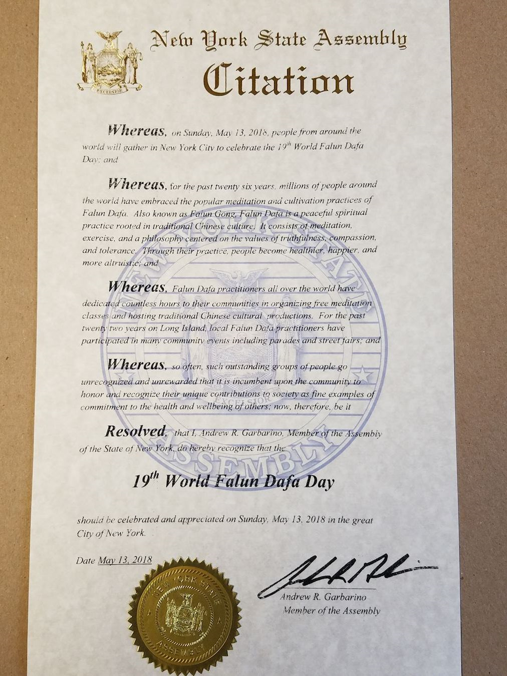 褒奖中还说:鉴于二零一八年五月十三日是第十九届世界法轮大法日。这一天全世界一亿的法轮大法修炼者和他们的家人朋友都会庆祝。大纽约地区也会庆祝。因此,发来褒奖特此祝贺,恭贺“第十九届世界法轮大法日”。