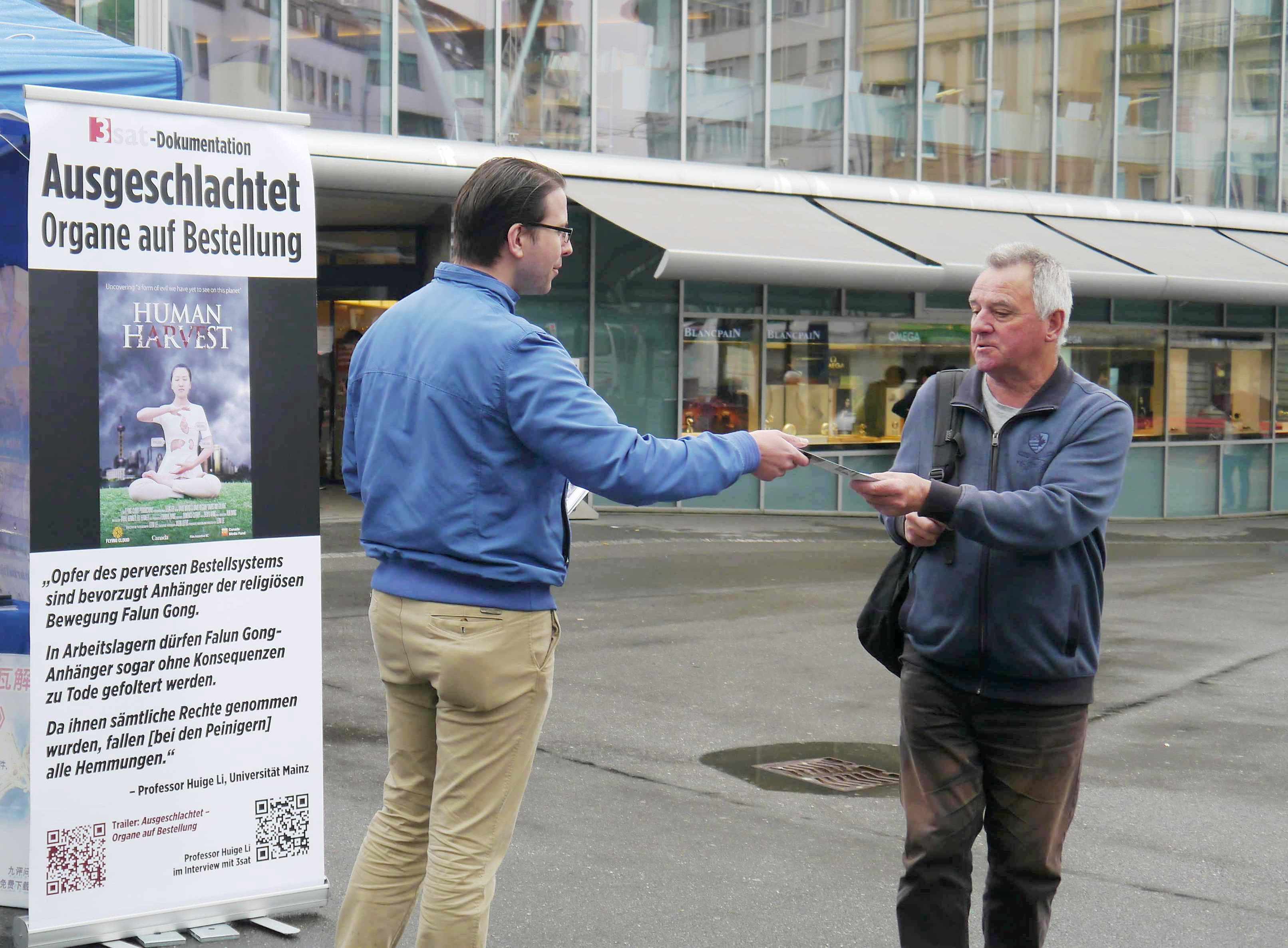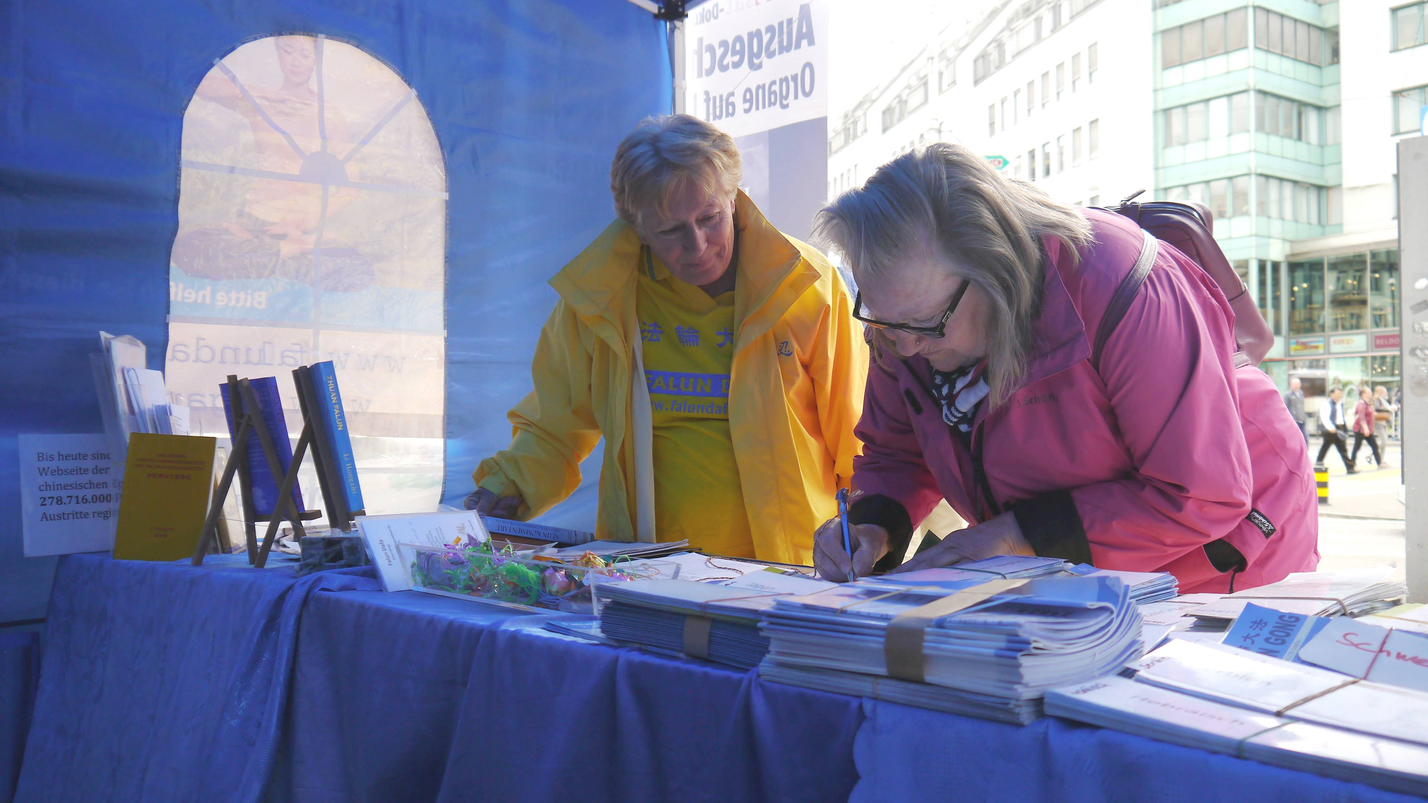 已退休的贝蒂娜(Bettina)是第一次听说法轮功,在听了法轮功学员的介绍后,她说:“法轮功是一个好的功法。我能感受到法轮功学员对自己负责,在生活中身体力行,改善自己的想法。”在签名后她说:“我希望能够通过签名制止摘取器官的罪行。怎么可以通过别人的器官来谋取利益?!我确信这(签名)是一件好事,我发自内心愿意帮助制止(迫害),让这种打坐,人生哲学(法轮功)的精神能够广为传播。”临走前她还谈到要上网了解关于更多的法轮功讯息。