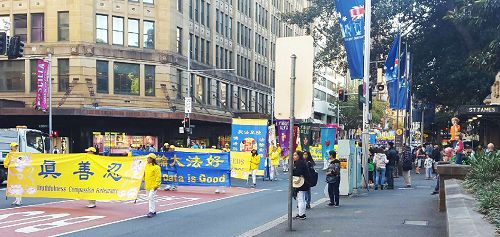 中午时分,法轮功学员的盛大游行队伍由天国乐团领队、声势浩荡地从悉尼马丁广场(Martin Place)前出发,沿悉尼商业主街游行至贝尔莫公园(Belmore Park)。沿途悉尼各界民众被祥和、亮丽又壮观的游行队伍震撼和吸引,纷纷驻足观看、拍摄留念并用社交媒体传播、分享至世界各地。