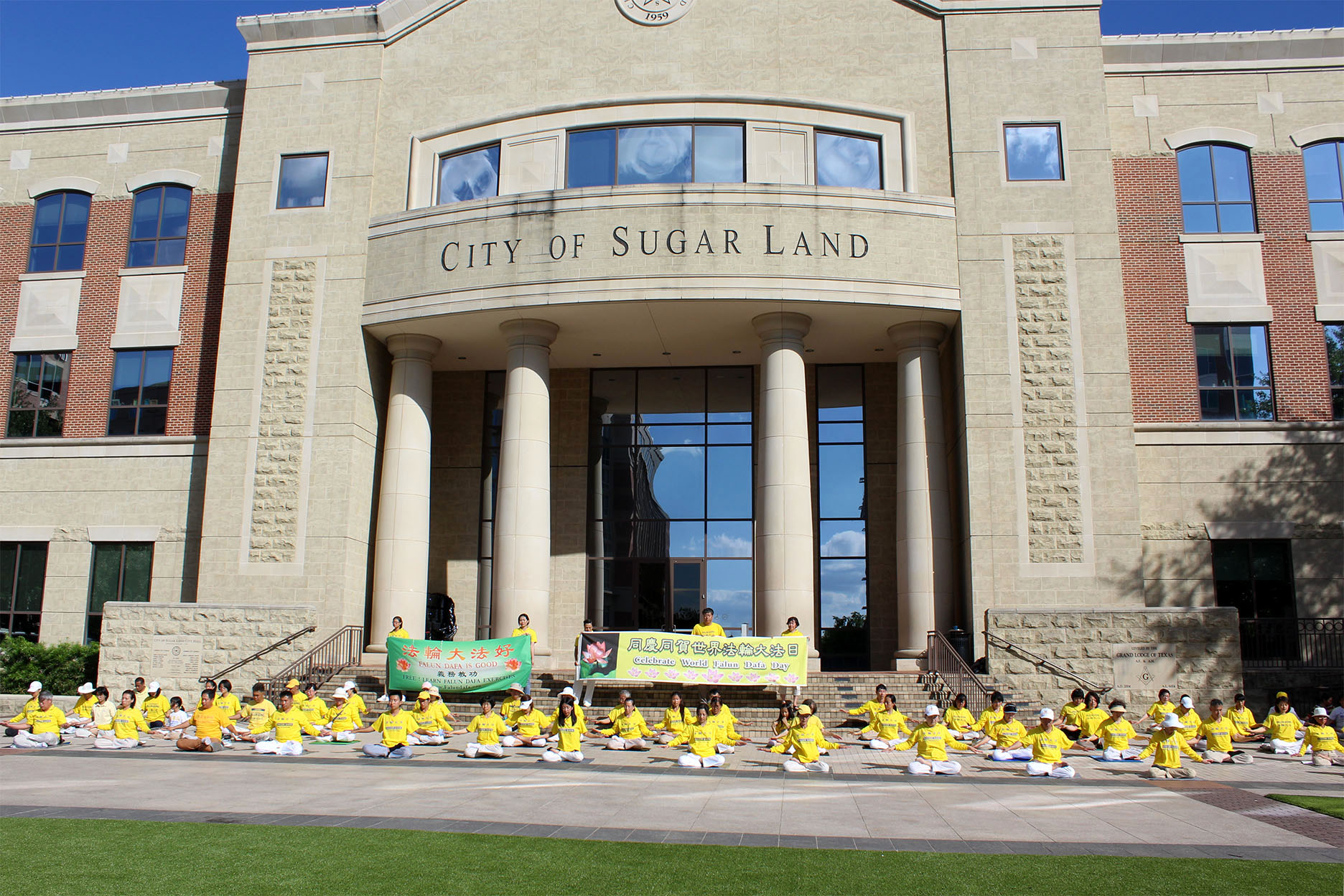 ![]() 休士顿法轮功学员在糖城市政府厅前炼功,庆祝世界法轮大法日。 |