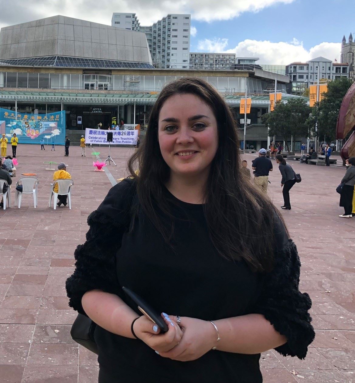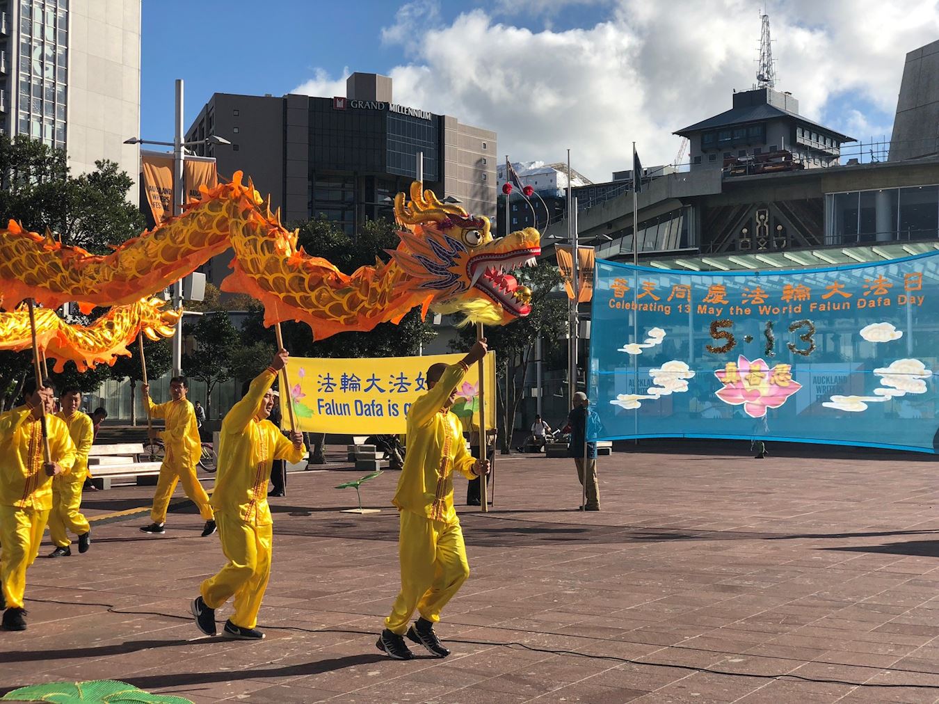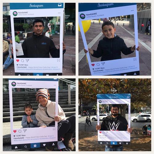 五月六日,雨后的奥克兰,空气分外清新,微风拂面,白云飘荡,新西兰法轮功学员聚集在AOTEA广场和来来往往的人们一起庆祝即将来临的“世界法轮大法日”。