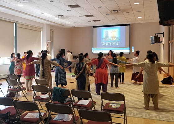 六月九日,纽约法轮功学员应邀到位于皇后区埃姆赫斯特区的一座印度寺庙教功。二十五人参加了当天的学功,现场气氛很热烈。