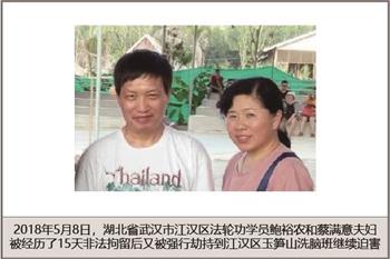 5月8日,鲍裕农、蔡满意夫妇被江汉区610联合北湖街派出所劫持到武汉市江汉区法制教育所,非法关押至今已经快一个月了,仍无法回家和家人团聚。