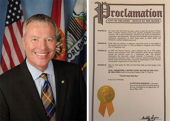 美国佛罗里达州奥兰多市市长巴迪·代尔(Buddy Dyer)颁发褒奖法轮大法弘传世界二十六周年,并宣布二零一八年五月十三日为奥兰多市“法轮大法日”。
