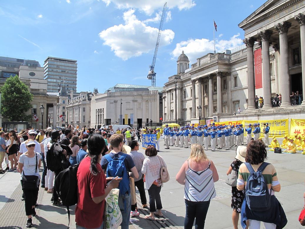'图4:二零一八年六月三日下午,法轮功学员在伦敦特拉法加广场传播真相,天国乐团的演奏震撼四方,来自世界各地的广大民众踊跃了解真相'
