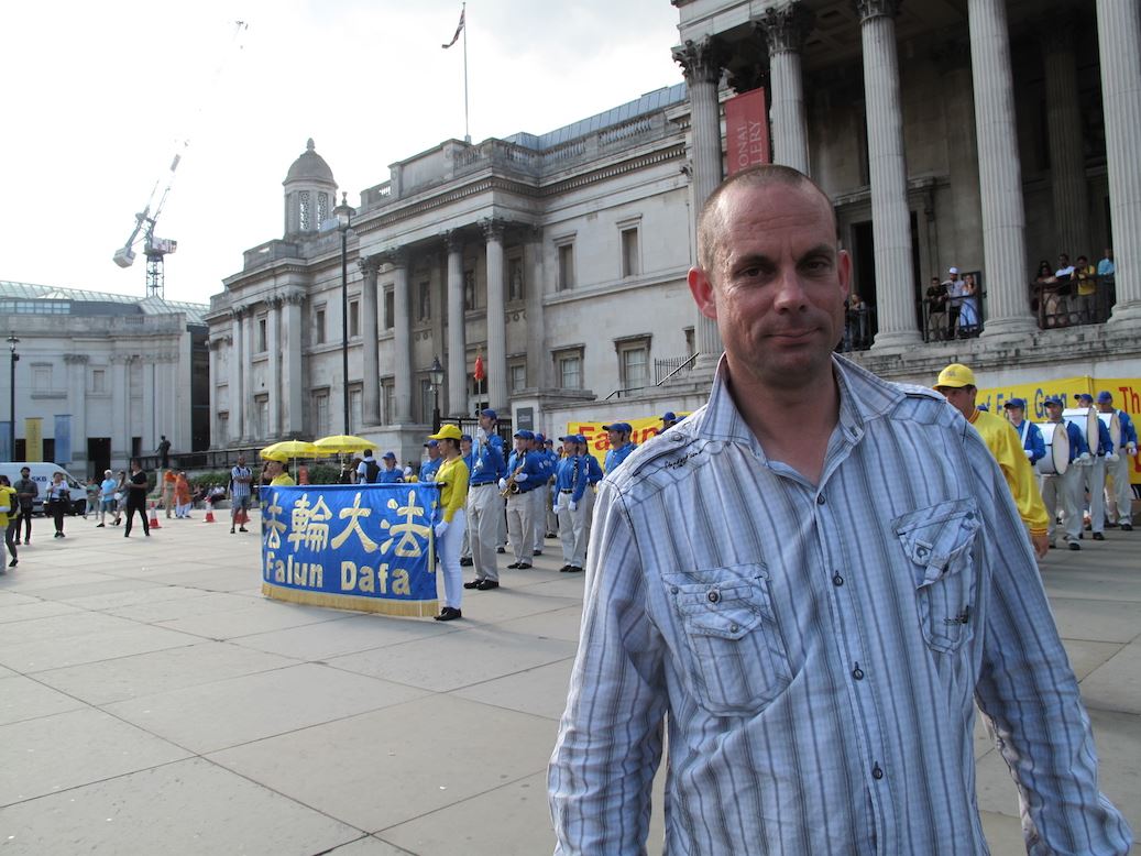 巴尼?普罗伯特(Barney Probert)在伦敦一家小型私人公司办公室工作, 周末经常到特拉法加广场观看街头艺术家表演,听说过法轮功。当天在特拉法加广场,他的注意力被法轮功学员讲真相活动,特别是天国乐团的演奏所吸引,他也感叹法轮功的平和能量:“我感受到一种很好的能量,不是来自一般的行进乐队的那类能量,而是更美好的能量,更纯粹的感觉。更多的是纯粹,是一种纯粹的能量。”