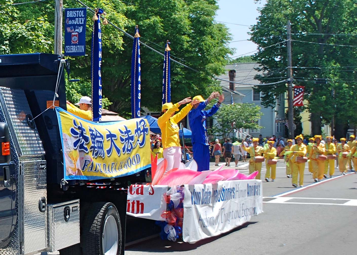 法轮功学员的游行队伍给民众耳目一新的感觉。走在最前面的是仙女队,她们打着“真、善、忍”的横幅。随后是大莲花花瓣围绕着竖型条幅英文“真、善、忍”横幅,在花车上的学员演示动作“缓、慢、圆”的功法。法轮功学员的花车获得了该游行的“最美花车”奖。