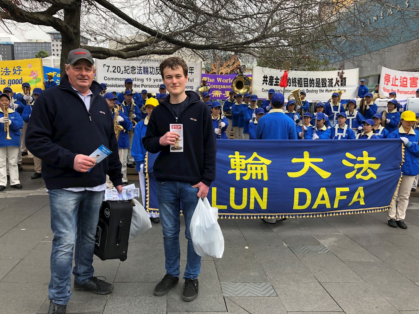 彼得·哈哥斯特(Peter Hugst )与儿子马修在法轮功学员的集会上驻足聆听很久,他在新西兰的新闻上知道法轮功被中共迫害,他一直以来都不喜欢共产党,对集会演讲人的观点非常赞同。他说,自己知道共产党是一个残酷的政党,但不知道有这么严重。他认为今天这样的活动非常好,他鼓励法轮功学员们要坚持下去。