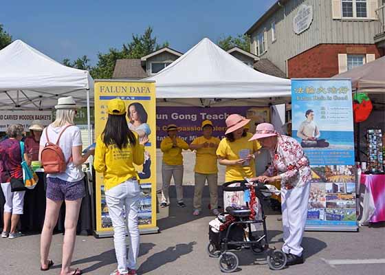 6月30日多伦多法轮功学员应邀参加了在安大略省斯图维尔市举办的草莓节,学员们在展位上传播法轮功的美好,许多民众当场学功。
