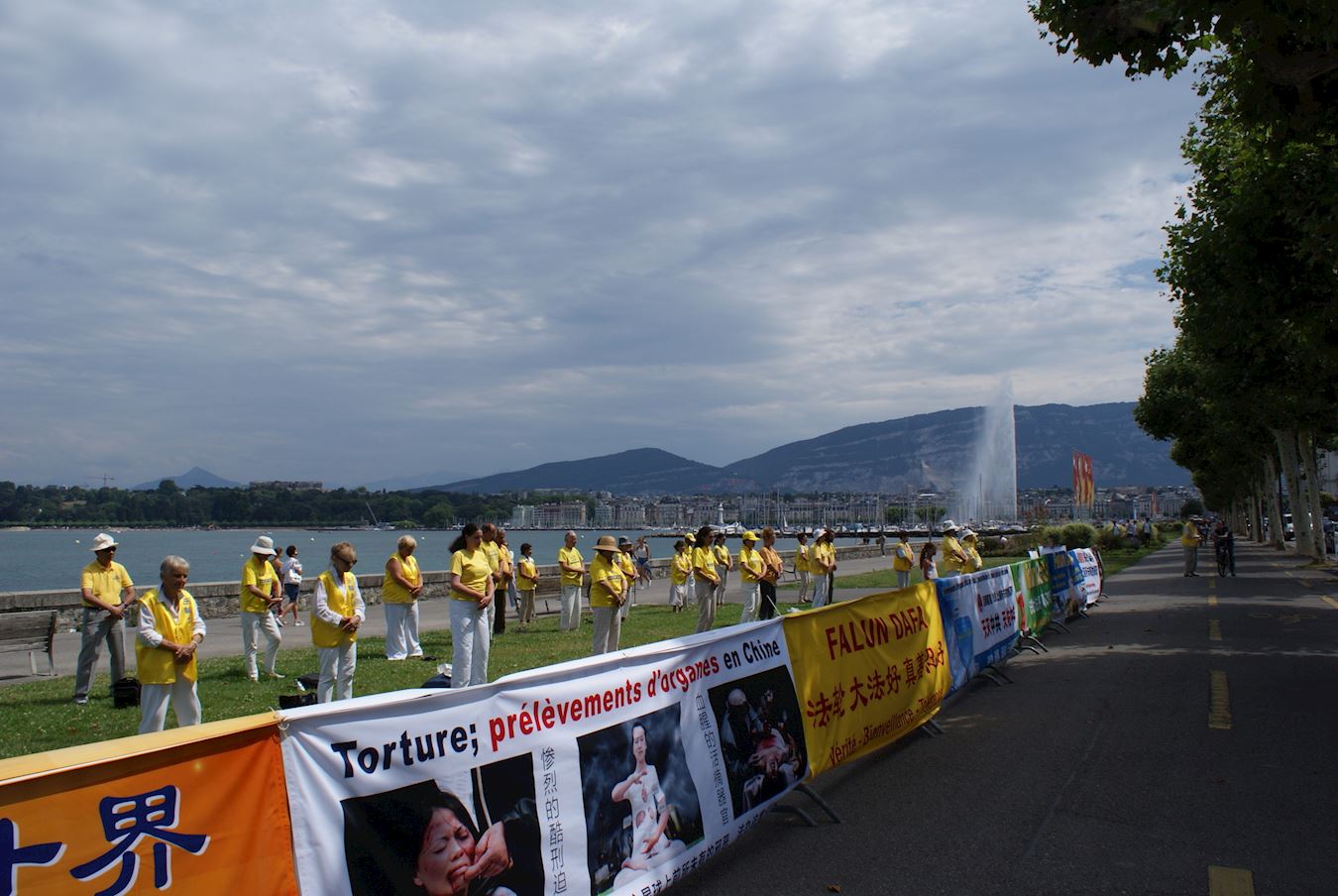 ![]() 图1:部份瑞士法轮功学员在坐落在日内瓦湖畔的联合国人权高级专员署前集体炼功 |