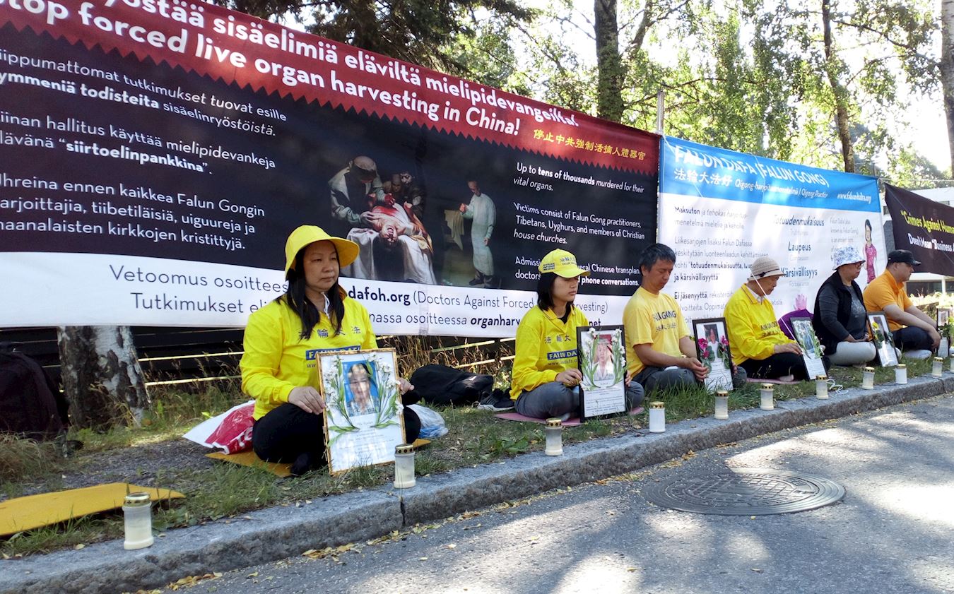 '图1:法轮功学员在芬兰中使馆旁静坐,抗议中共十九年来对法轮功学员的残酷迫害'