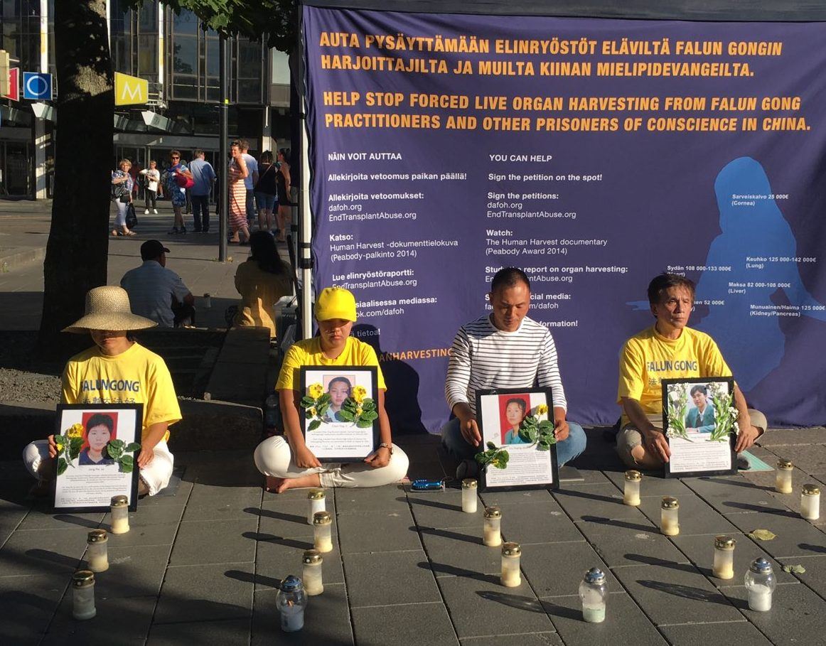 下午五点,法轮功学员来到热闹的甘比(Kamppi)购物中心附近举行烛光悼念,纪念被中共迫害致死的同修,并向民众讲述发生在中国的迫害事实。